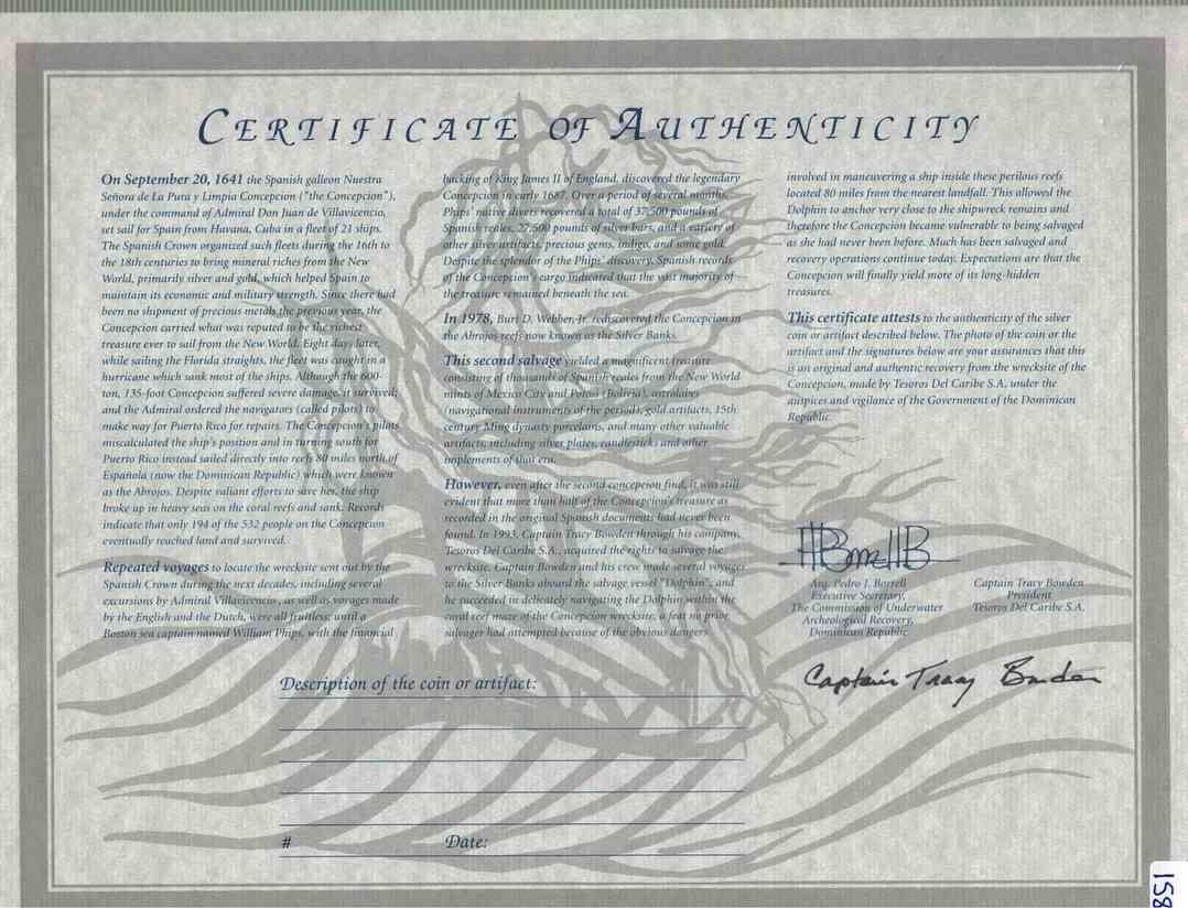 MEXICO, Mexico City, cob 8 reales, Philip IV, assayer P. S-M19; KM-45; Cal-Type 319. 25.74 grams. Solid and largely corrosion-free but a bit weakly struck, the shield and cross full nonetheless, with clear oMP and 8, lightly toned. With original certificate from Captain Tracy Bowden through his contract with the Dominican Republic. Recovered from: Concepción, sunk in 1641 off Hispaniola