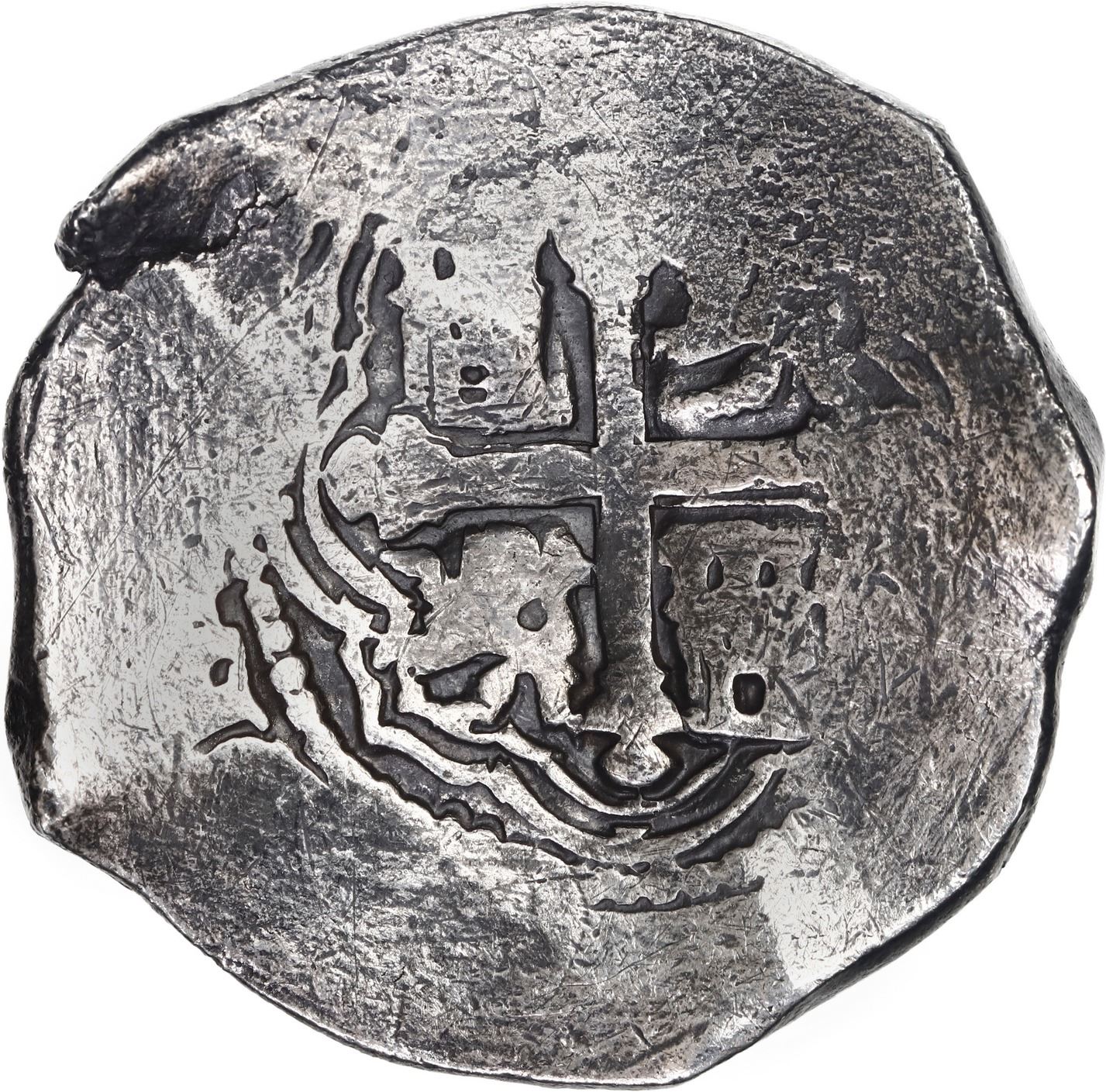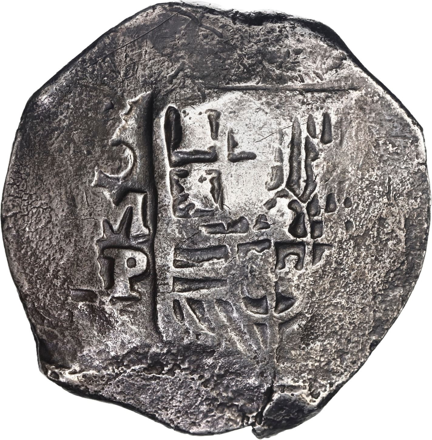 MEXICO, Mexico City, cob 8 reales, Philip IV, assayer P. S-M19; KM-45; Cal-Type 319. 25.85 grams. Broad flan with flat peripheries due to uneven thickness, very bold full oMP, full cross and most of shield, minimal surface corrosion, lightly toned. With original certificate from Captain Tracy Bowden through his contract with the Dominican Republic. Recovered from: Concepción, sunk in 1641 off Hispaniola