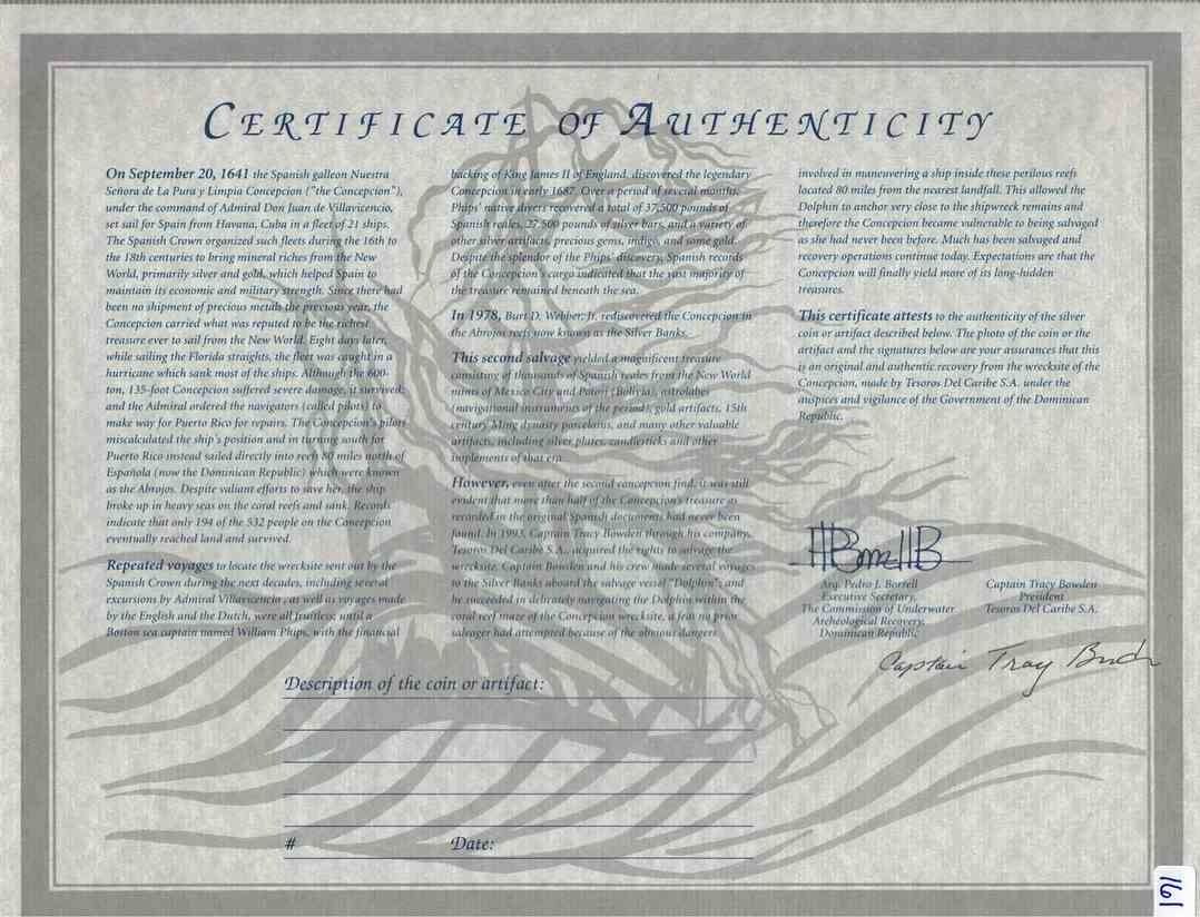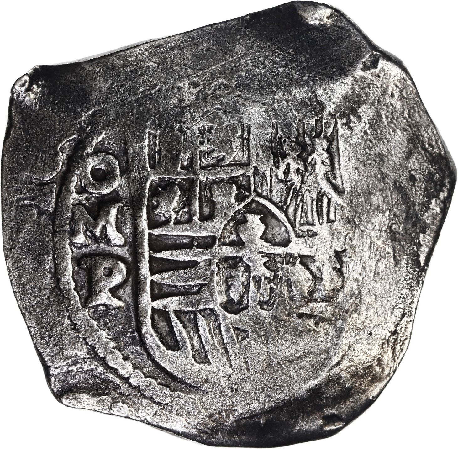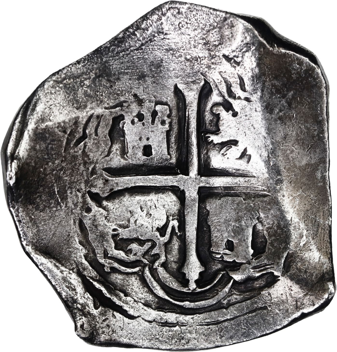 MEXICO, Mexico City, cob 8 reales, Philip IV, assayer P. S-M19; KM-45; Cal-Type 319. 26.25 grams. Broad flan (roundish but with one straight edge) with typically flat peripheries due to uneven thickness, very bold full oMP, full shield, good full cross, no corrosion, lightly toned. With original certificate from Captain Tracy Bowden through his contract with the Dominican Republic. Recovered from: Concepción, sunk in 1641 off Hispaniola
