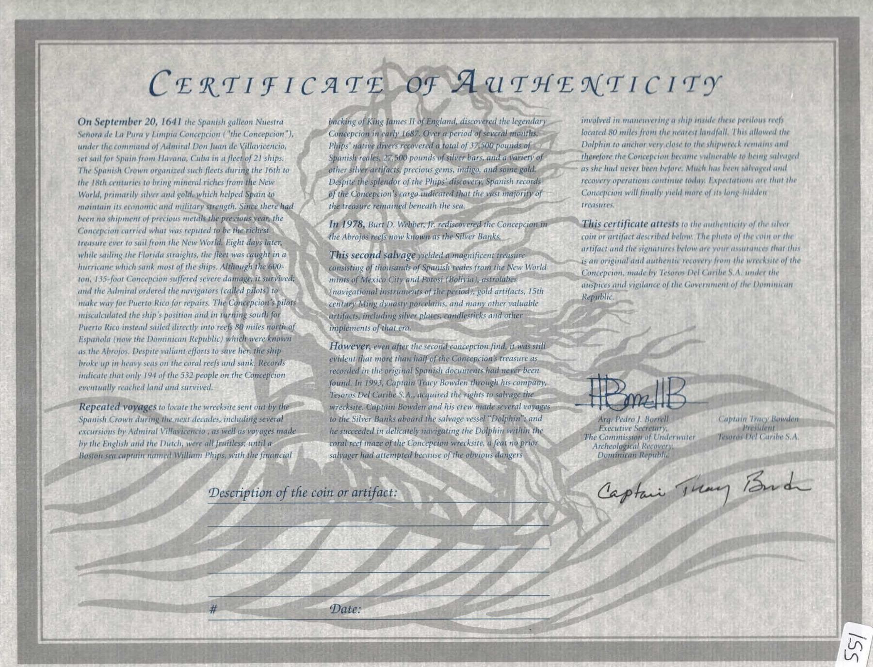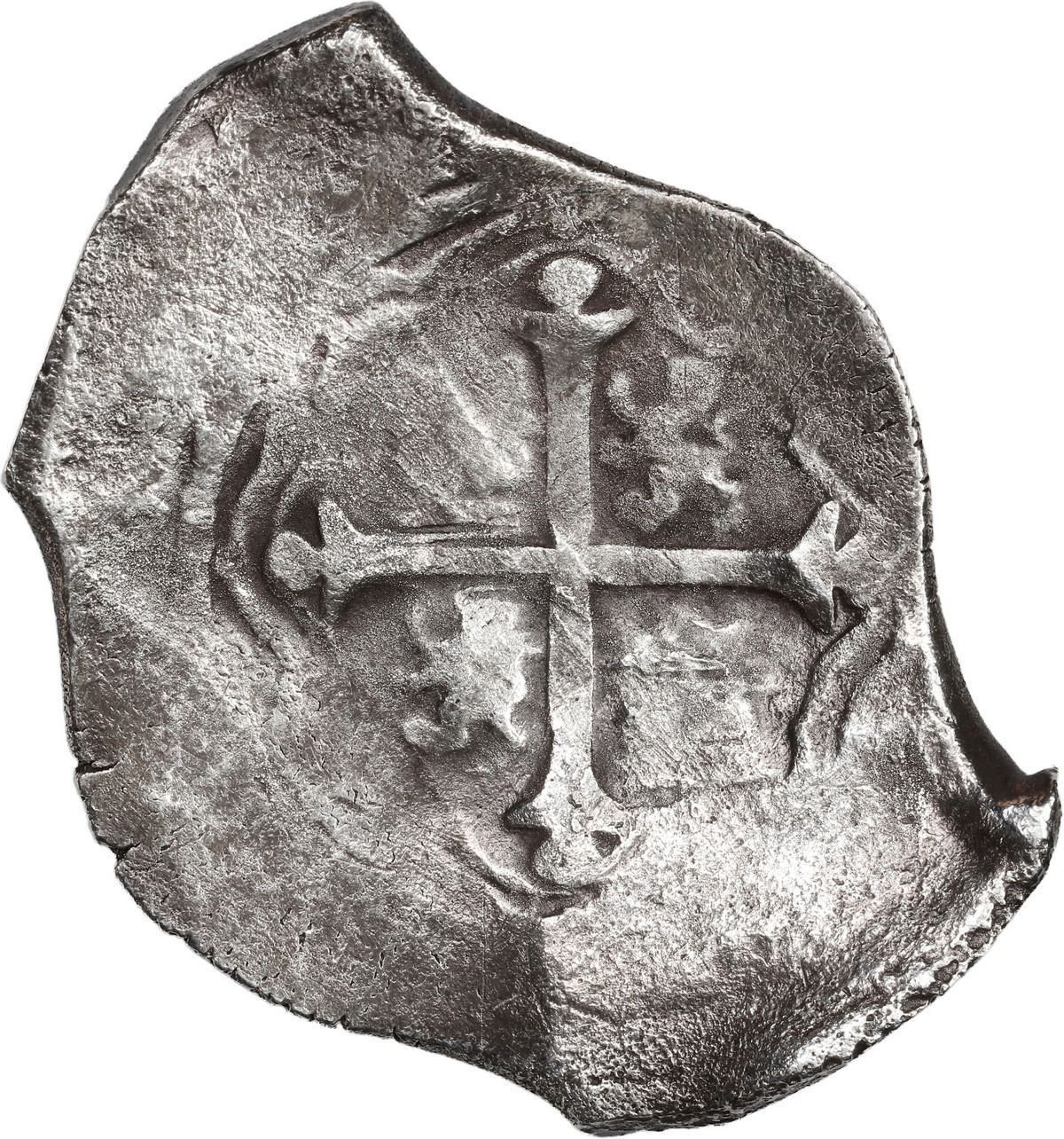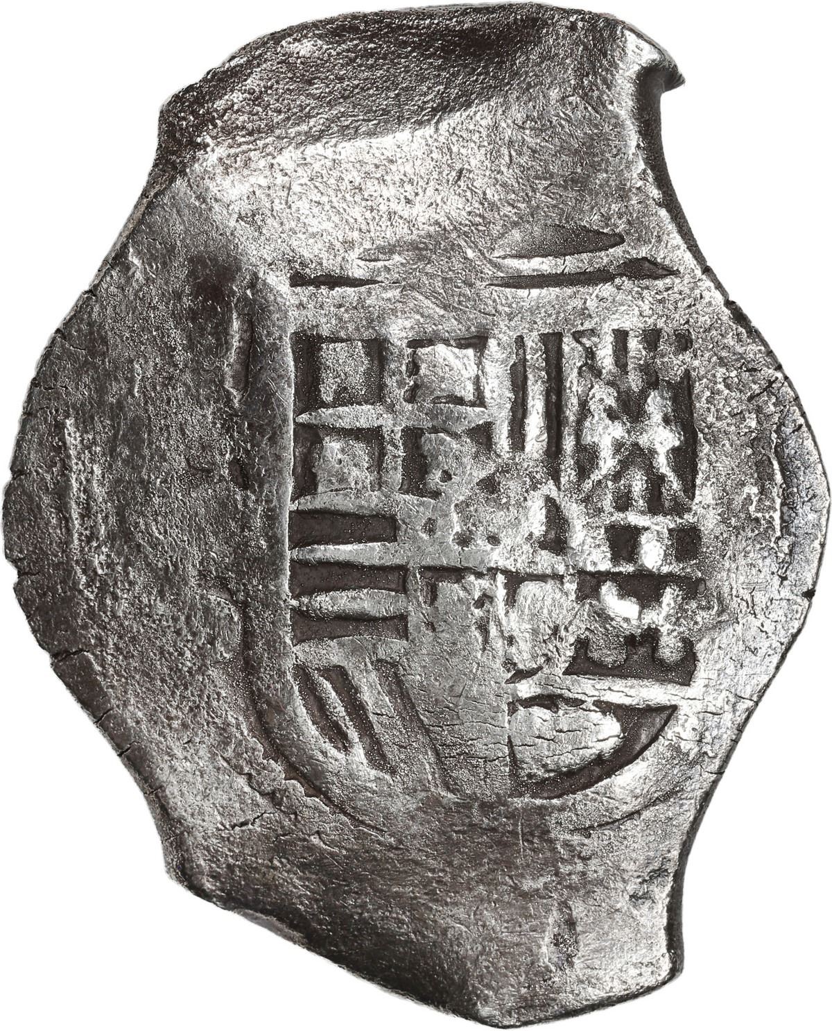 MEXICO, Mexico City, cob 8 reales, Philip IV, assayer P. S-M19; KM-45; Cal-Type 319. 26.34 grams. Long barrel-shaped flan with much uneven thickness, great full cross, full shield, peripherally flat but virtually corrosion-free, very lightly toned. With original certificate from Captain Tracy Bowden through his contract with the Dominican Republic. Recovered from: Concepción, sunk in 1641 off Hispaniola