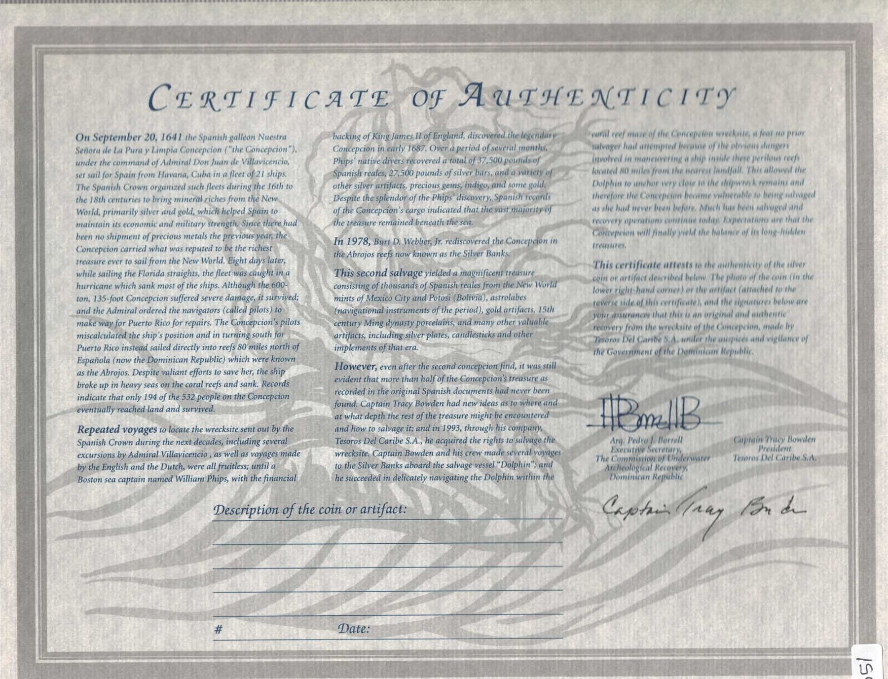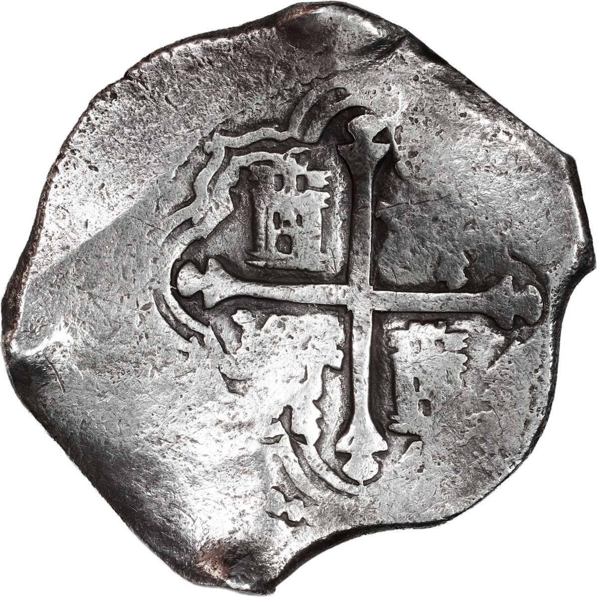 MEXICO, Mexico City, cob 8 reales, Philip IV, assayer P. S-M19; KM-45; Cal-Type 319. 26.83 grams. Choice coin with nice full cross and shield, no corrosion, flat peripheries and unevenly thick edge (blunted points, as made), contrastingly toned. With original certificate from Captain Tracy Bowden through his contract with the Dominican Republic. Recovered from: Concepción, sunk in 1641 off Hispaniola