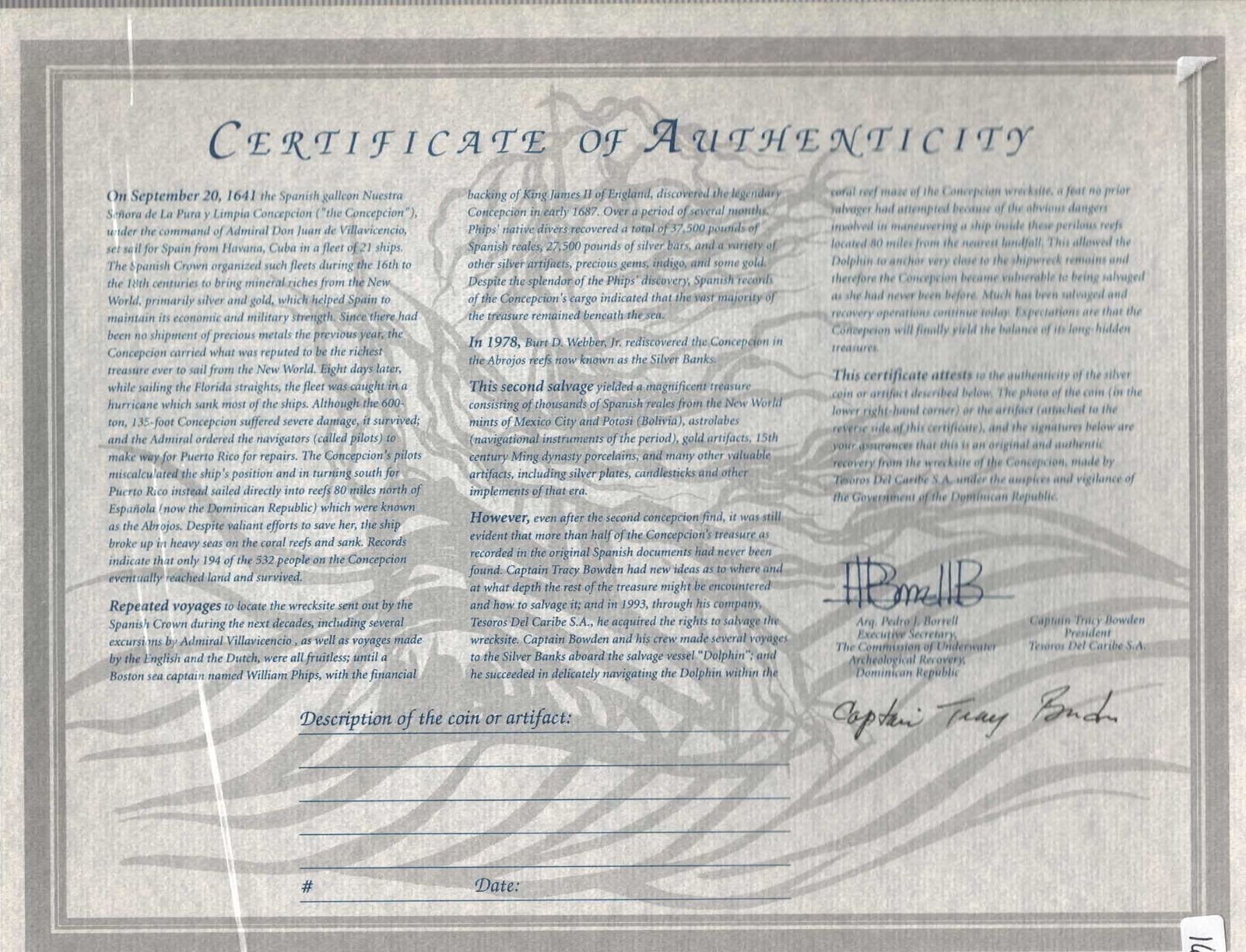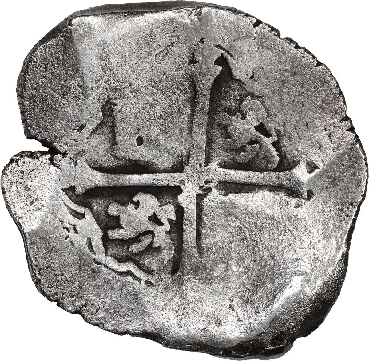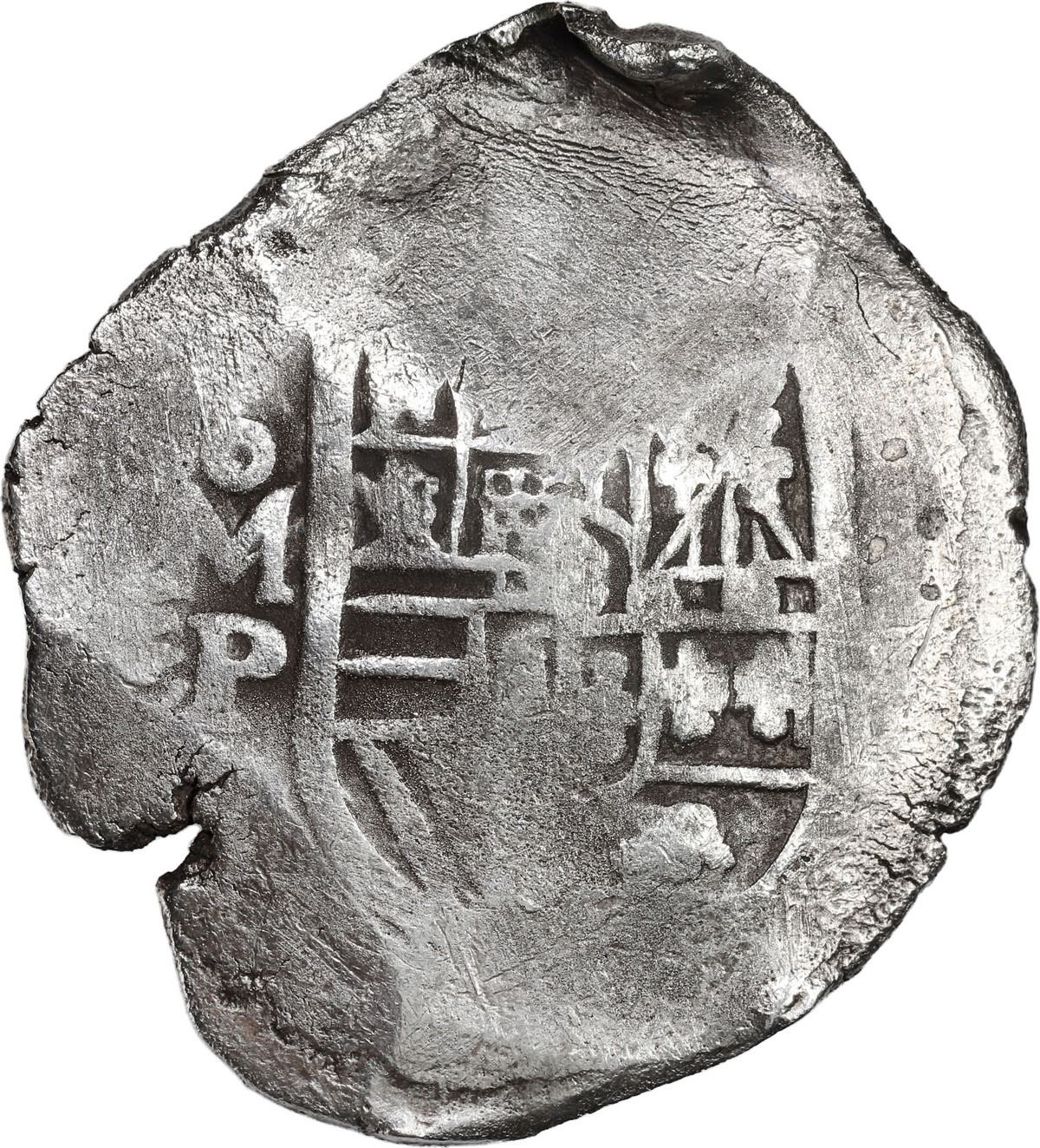 MEXICO, Mexico City, cob 8 reales, Philip IV, assayer P. S-M19; KM-45; Cal-Type 319. 25.07 grams. Bold full oMP, most of shield and cross but largely flat (as made) and with part of edge slightly bent, also small edge-crack, practically no corrosion, toned in crevices. With original certificate from Captain Tracy Bowden through his contract with the Dominican Republic. Recovered from: Concepción, sunk in 1641 off Hispaniola