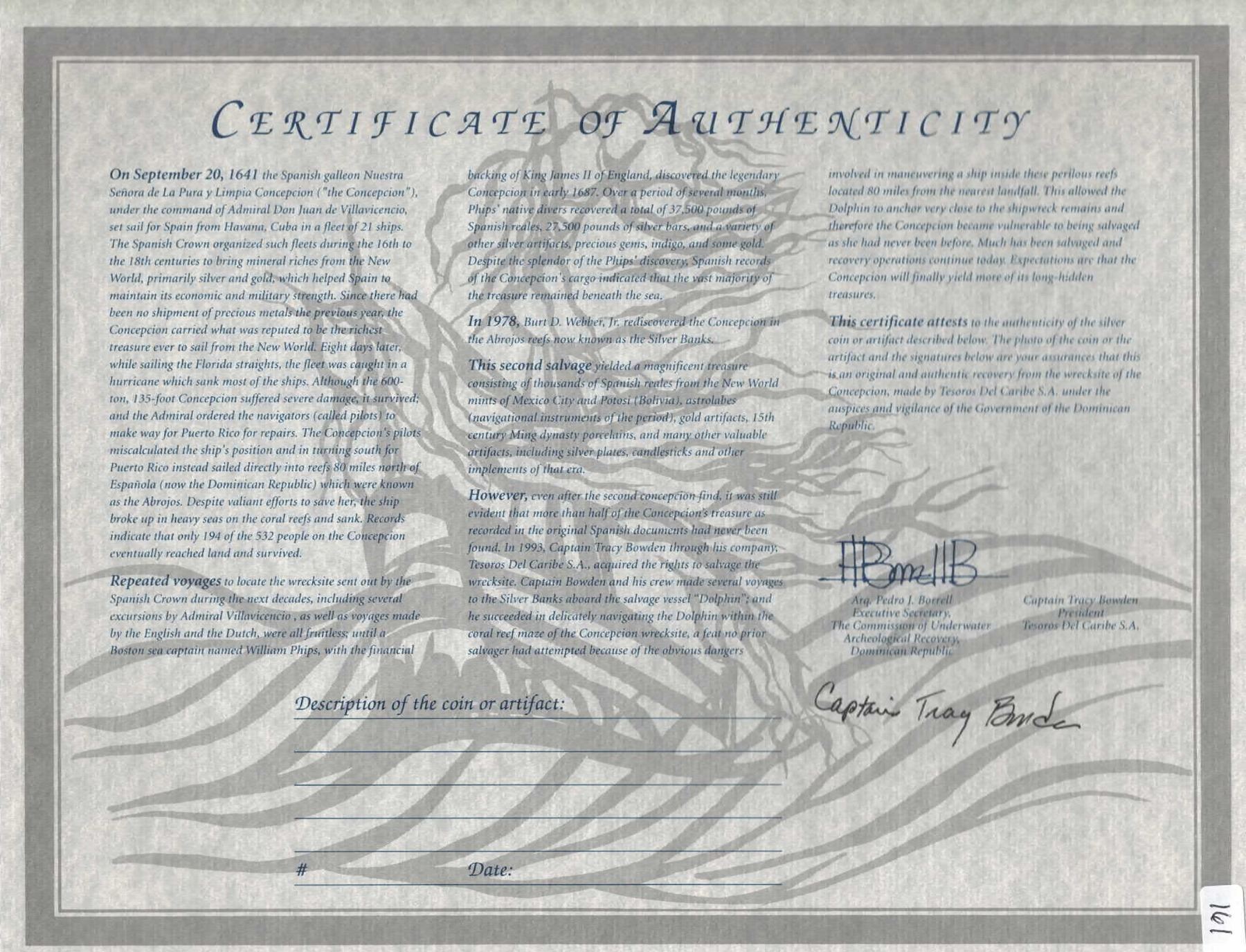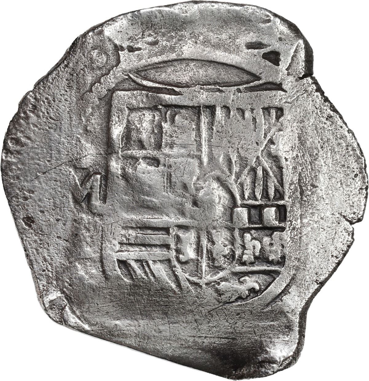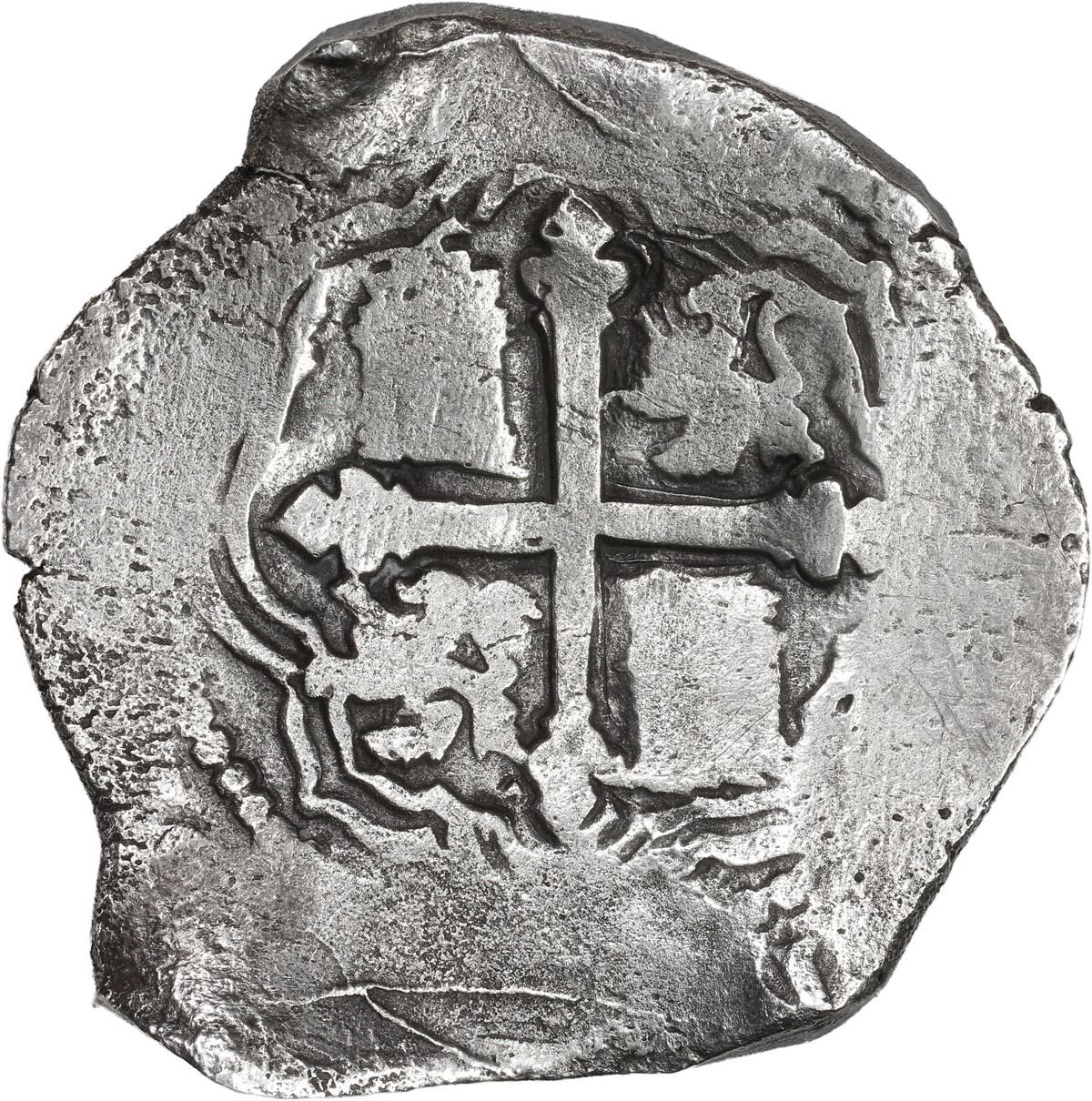 MEXICO, Mexico City, cob 8 reales, Philip IV, assayer P. S-M19; KM-45; Cal-Type 319. 24.71 grams. Somewhat barrel-shaped flan with great full cross and shield but peripheries flat, no corrosion, unevenly thick edge with blunted points (as made), very lightly toned. With original certificate from Captain Tracy Bowden through his contract with the Dominican Republic. Recovered from: Concepción, sunk in 1641 off Hispaniola