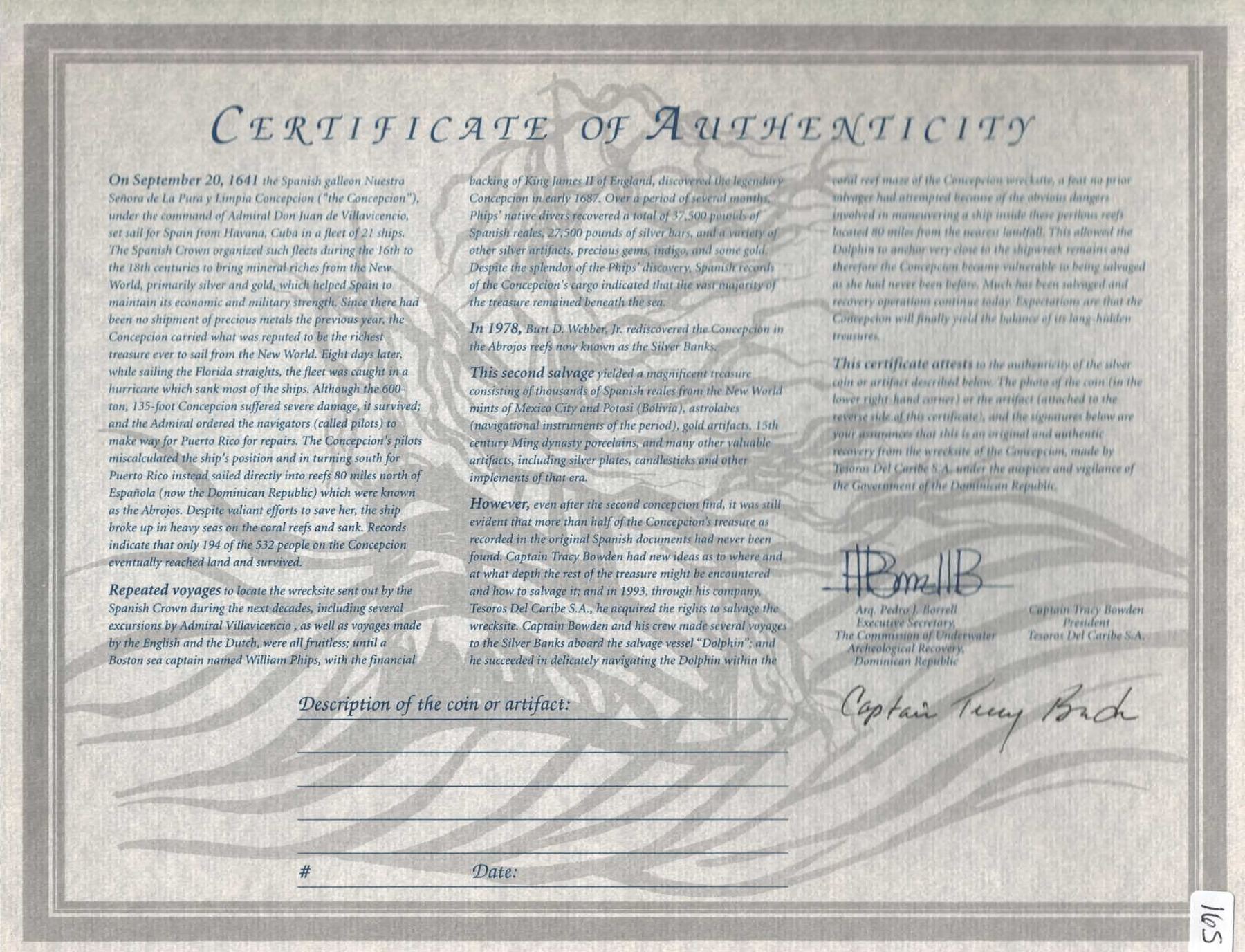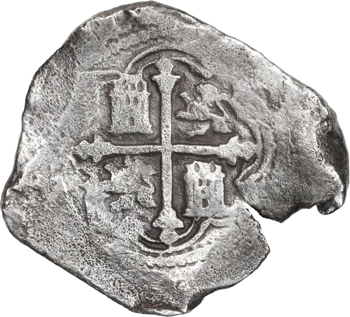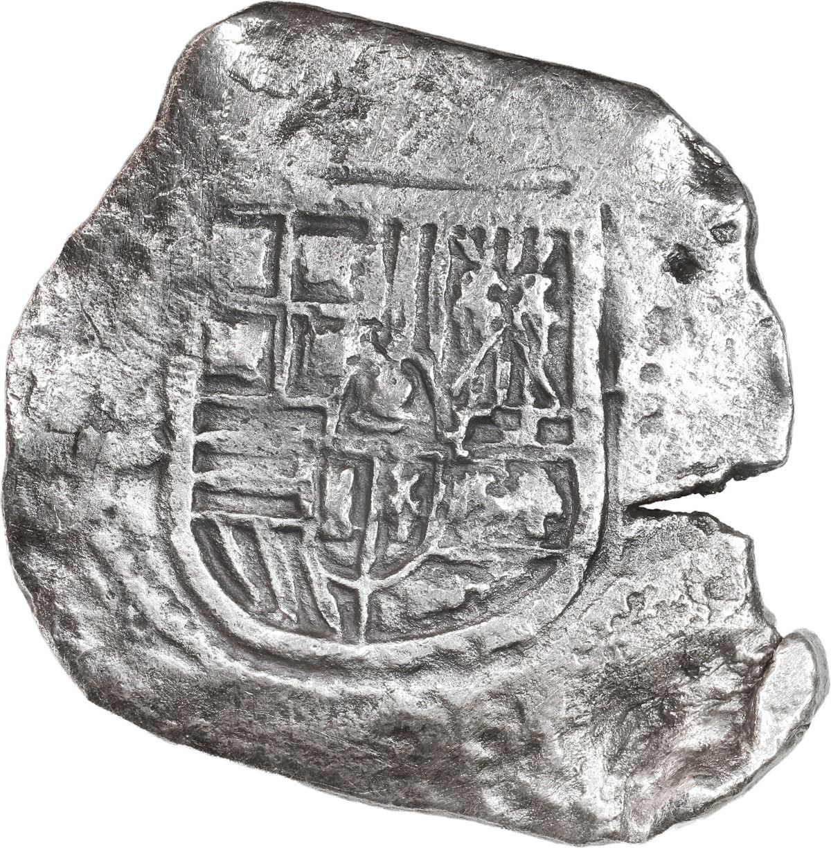 MEXICO, Mexico City, cob 8 reales, Philip IV, assayer P. S-M19; KM-45; Cal-Type 319. 22.11 grams. Broad, odd-shaped flan with crack and small part of edge bent, choice full shield (small) and cross, nicely toned, some surface corrosion. With original certificate from Captain Tracy Bowden through his contract with the Dominican Republic. Recovered from: Concepción, sunk in 1641 off Hispaniola