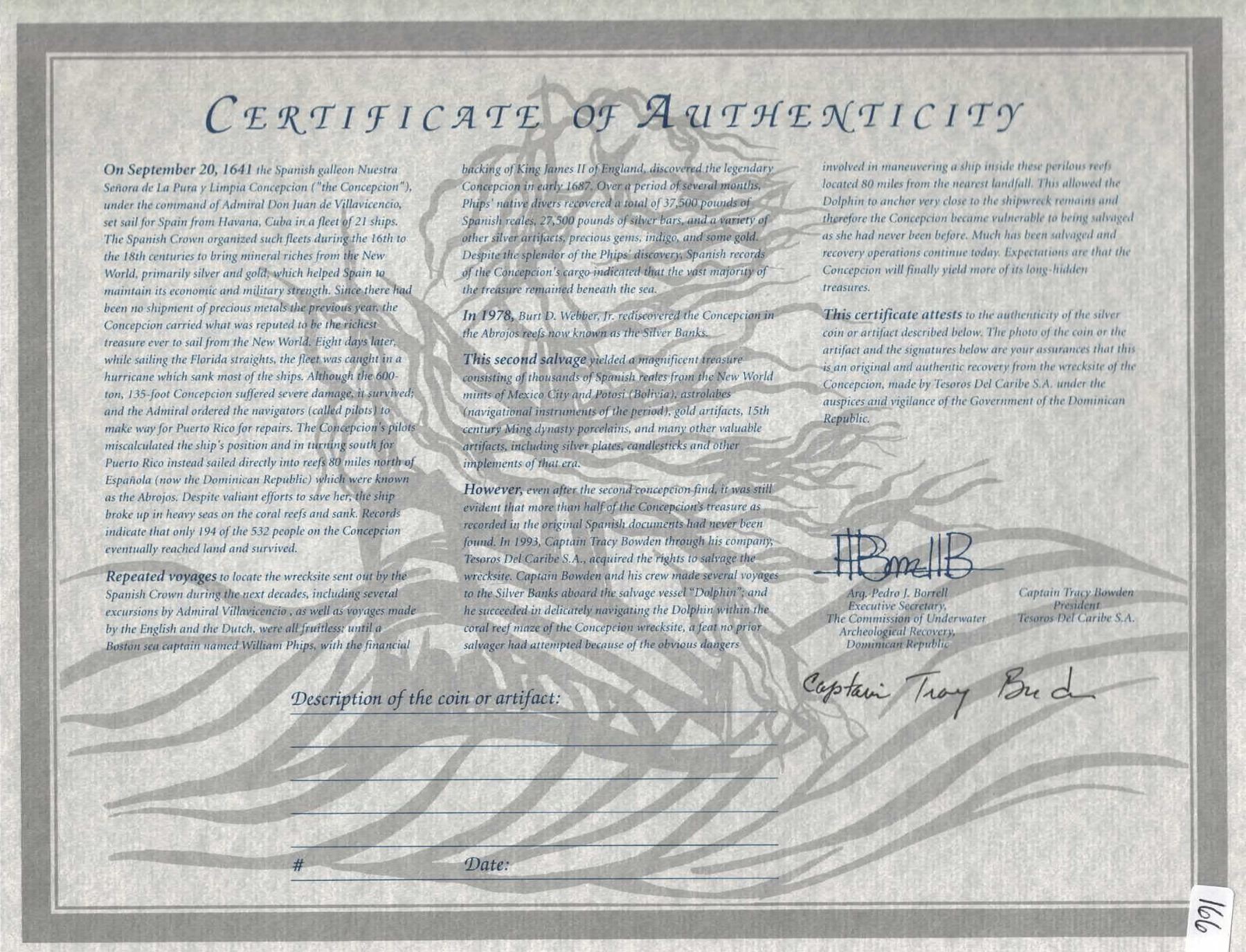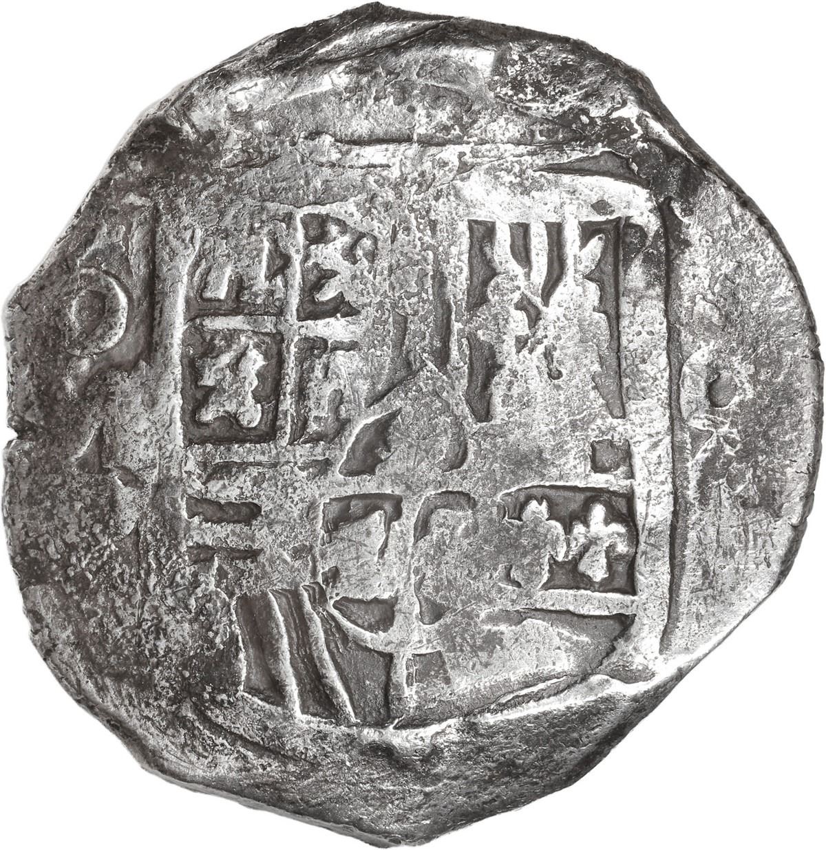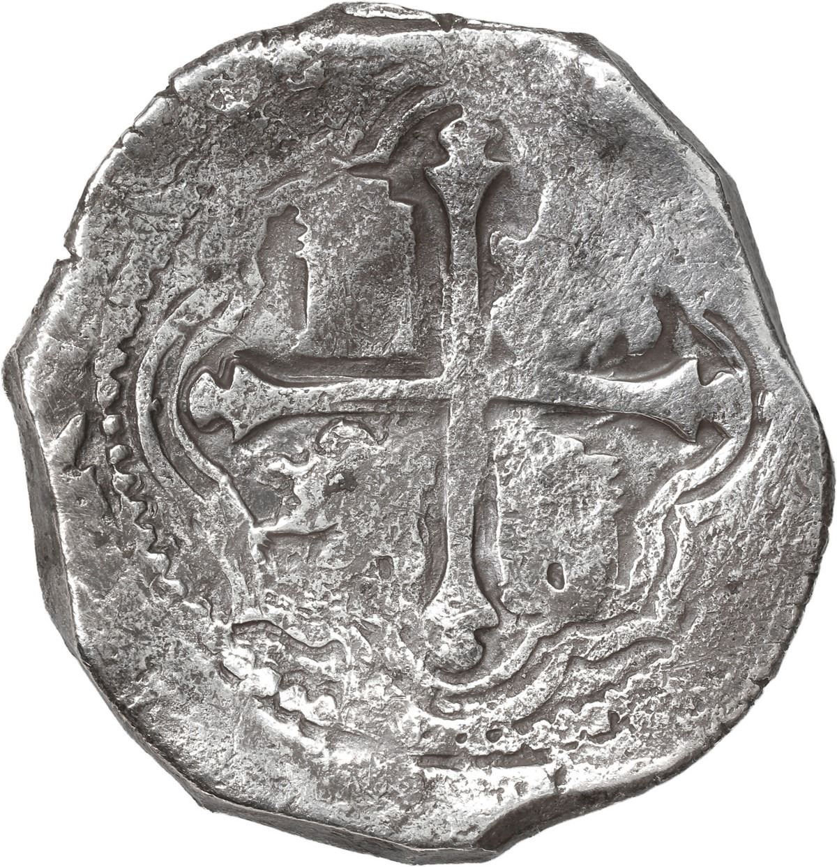 MEXICO, Mexico City, cob 8 reales, Philip IV, assayer P. S-M19; KM-45; Cal-Type 319. 27.04 grams. Thick, roundish flan with well-centered full cross and shield, nicely toned, full weight despite light surface corrosion. With original certificate from Captain Tracy Bowden through his contract with the Dominican Republic. Recovered from: Concepción, sunk in 1641 off Hispaniola