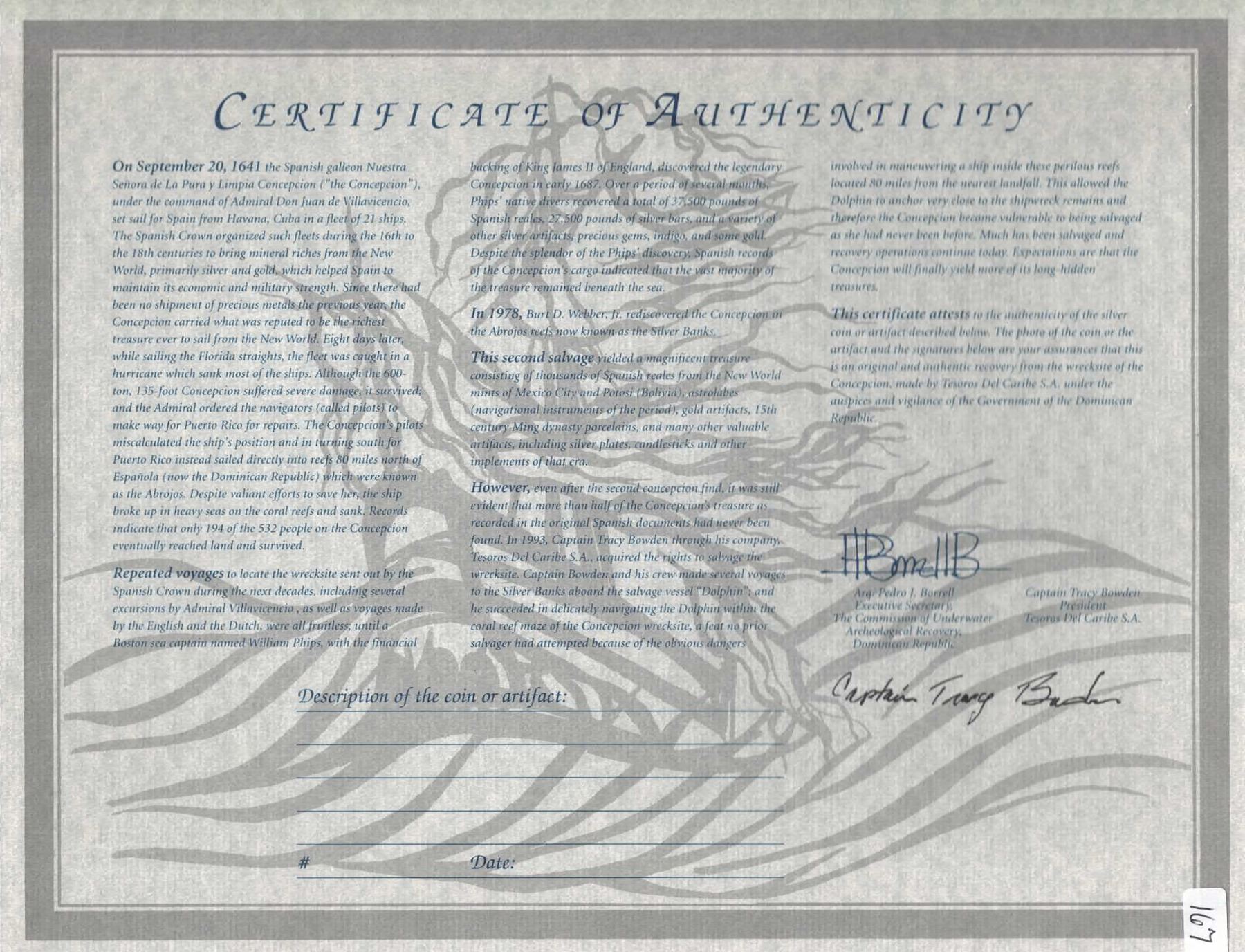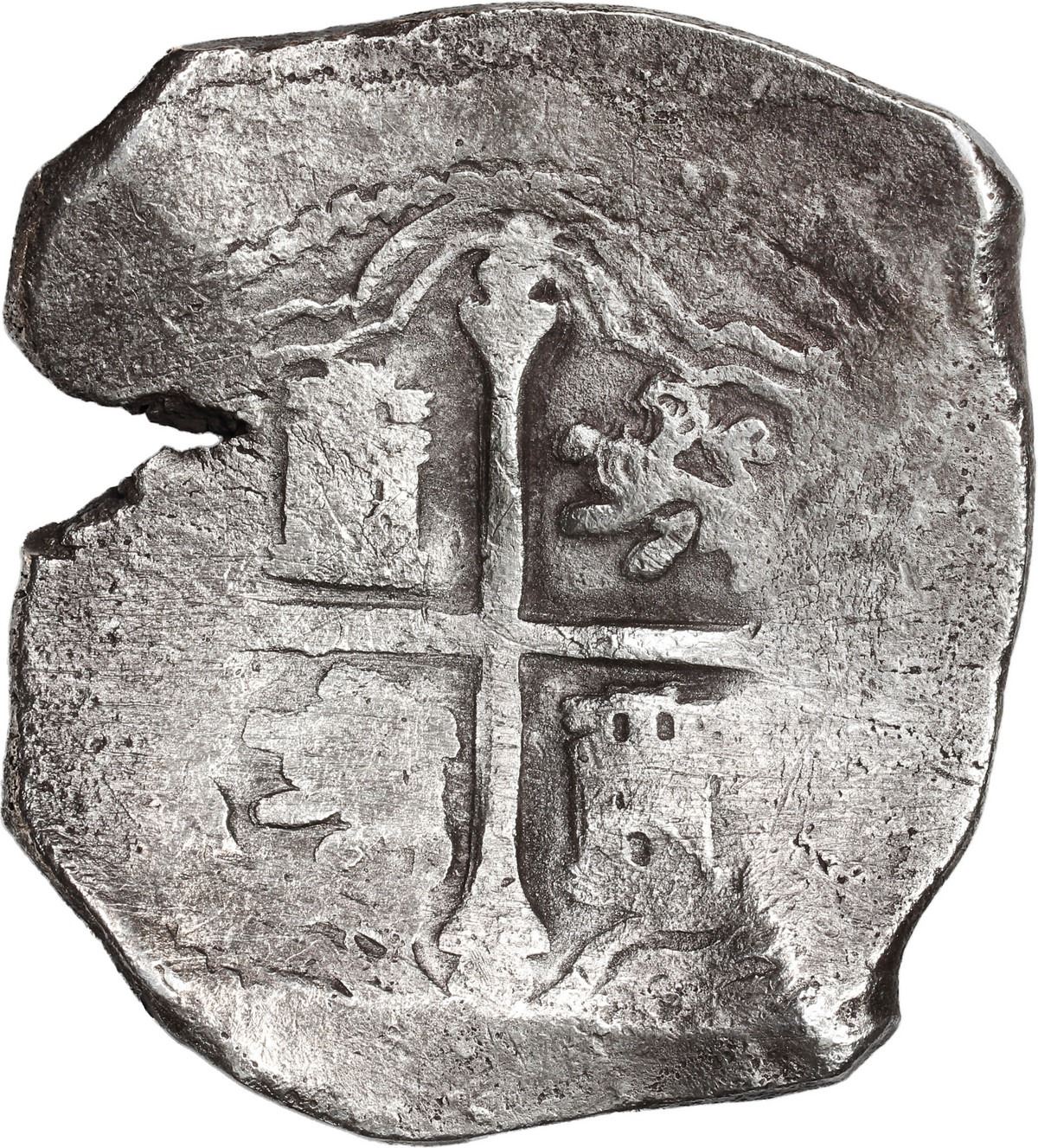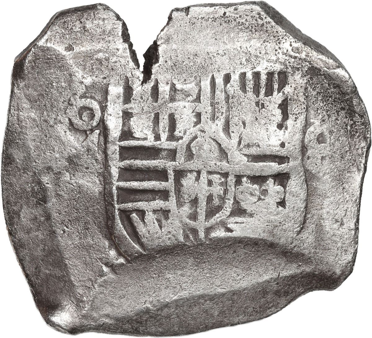 MEXICO, Mexico City, cob 8 reales, Philip IV, assayer P. S-M19; KM-45; Cal-Type 319. 26.46 grams. Odd-shaped flan with edge-split and prominent hammer-mark (as made), full mintmark, nearly full shield and cross but peripherally flat, lightly toned, nearly corrosion-free. With original certificate from Captain Tracy Bowden through his contract with the Dominican Republic. Recovered from: Concepción, sunk in 1641 off Hispaniola