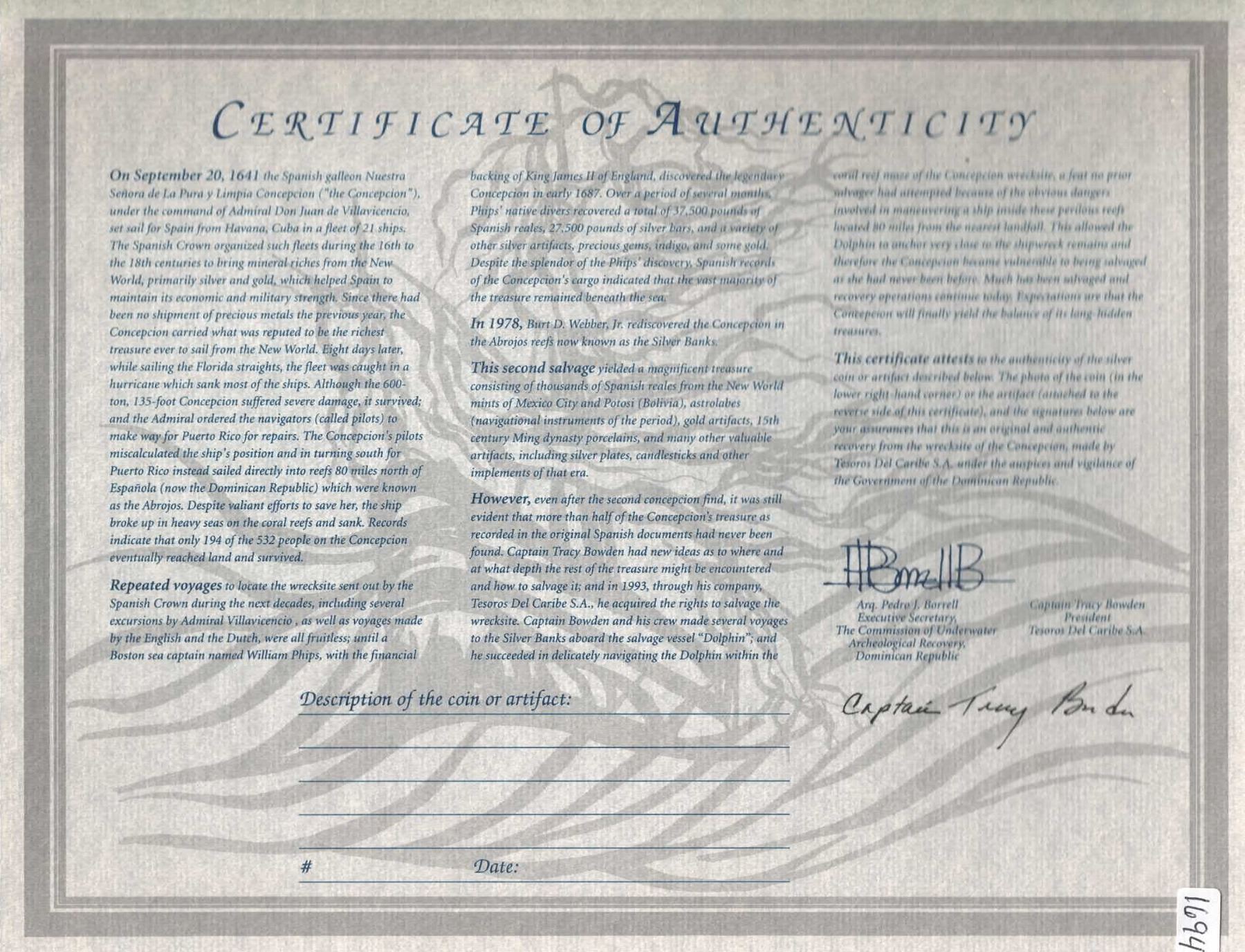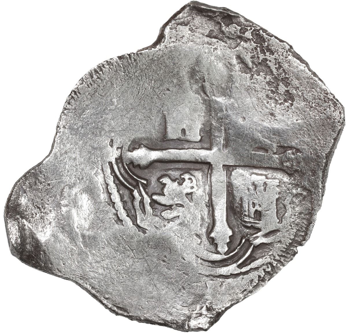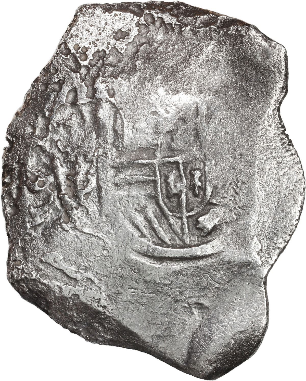 MEXICO, Mexico City, cob 8 reales, Philip IV, assayer P. S-M19; KM-45; Cal-Type 319. 22.39 grams. Very broad, barrel-shaped piece with minor surface pitting but otherwise solid and detailed with clear assayer to left of partial shield, nearly complete cross (albeit a little off-center). With original certificate from Captain Tracy Bowden through his contract with the Dominican Republic. Recovered from: Concepción, sunk in 1641 off Hispaniola