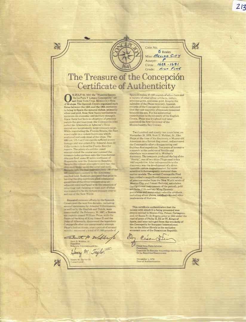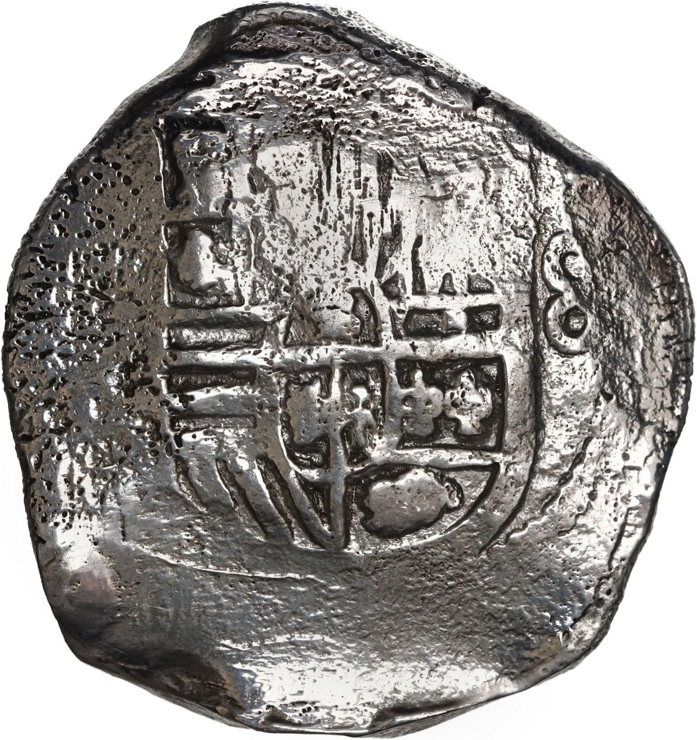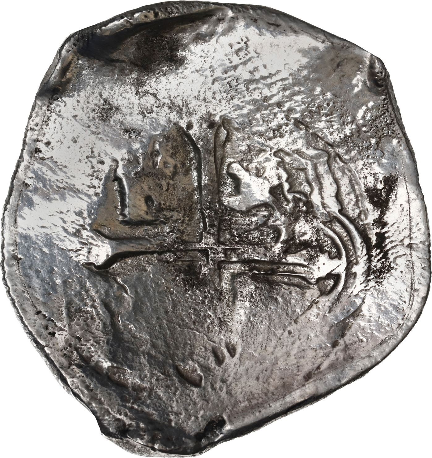 MEXICO, Mexico City, cob 8 reales, Philip IV, assayer not visible (P). S-M19; KM-45; Cal-Type 319. 23.92 grams. Broad flan with peripheral flatness due to uneven thickness, nearly full shield and cross and denomination 8, silvery, only light surface corrosion (the low weight notwithstanding), with faint canvas impression on reverse. With certificate and tag 11,862 from the salvors. Recovered from: Concepción, sunk in 1641 off Hispaniola