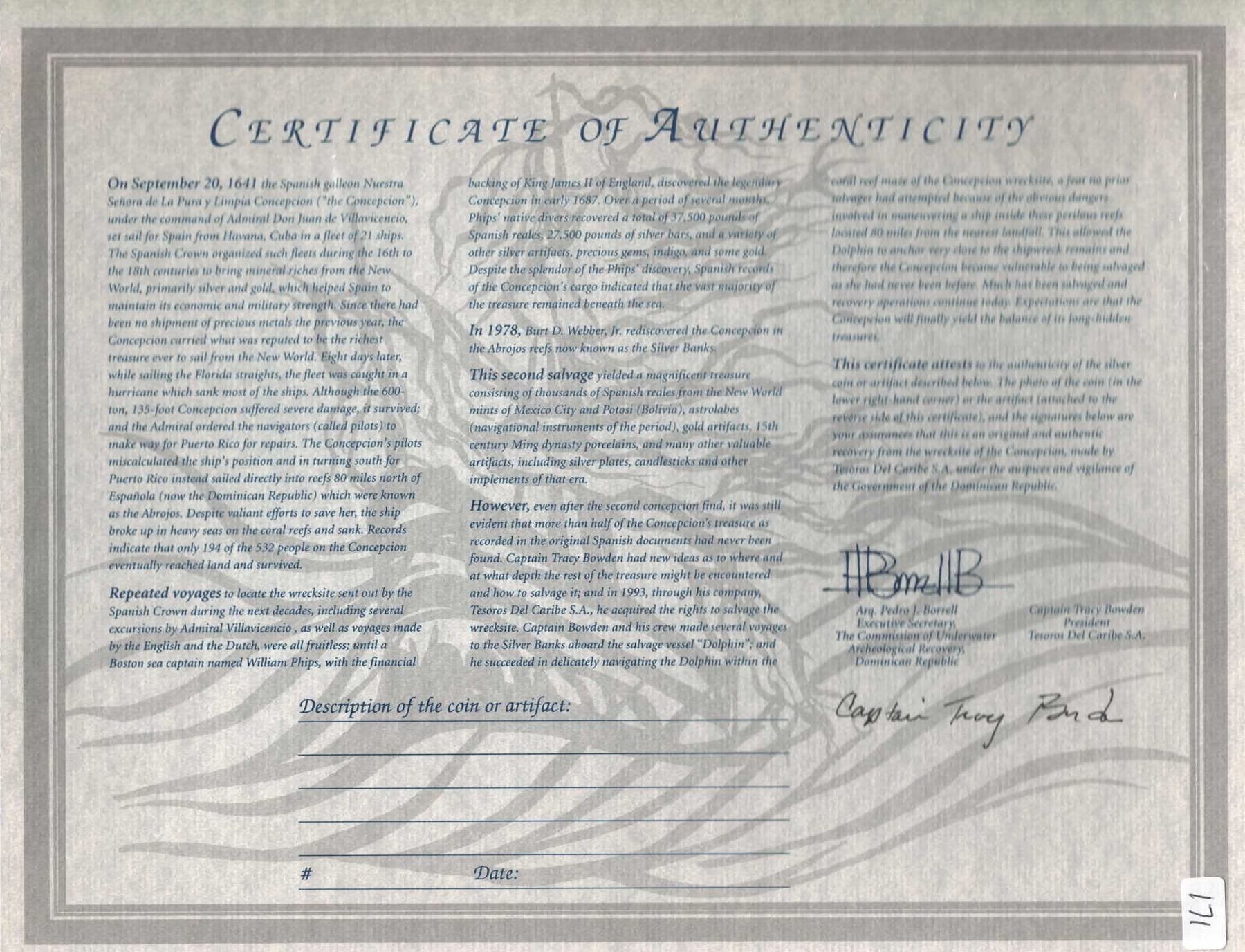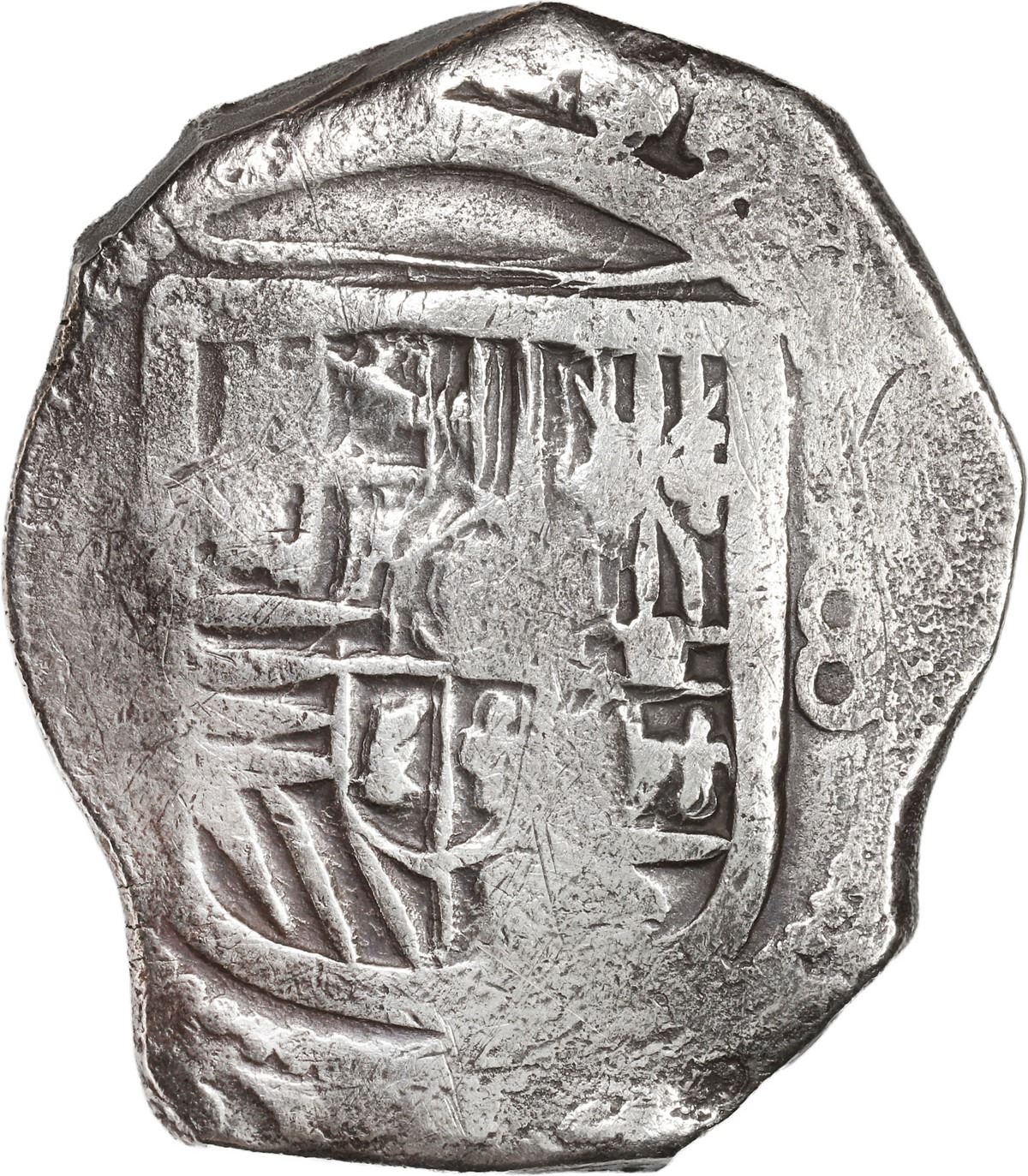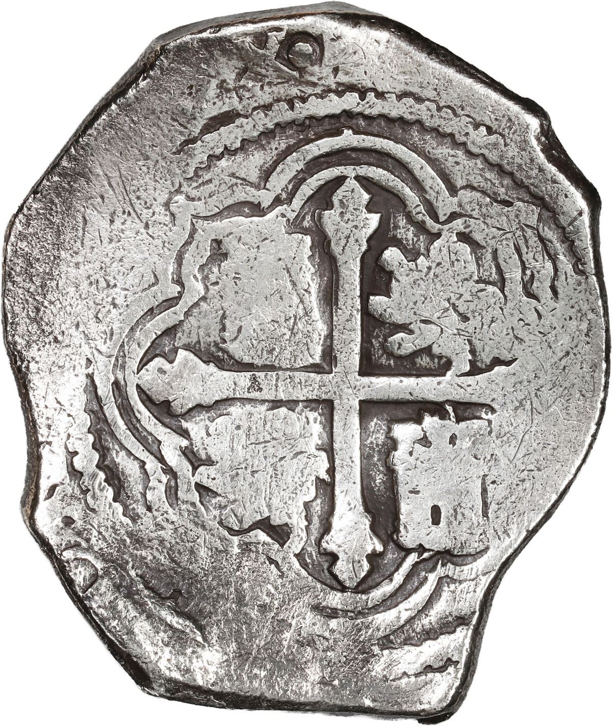 MEXICO, Mexico City, cob 8 reales, Philip IV, assayer not visible (P). S-M19; KM-45; Cal-Type 319. 26.43 grams. Thick urn-shaped flan with good full shield and cross but no peripheral details, minimal surface corrosion, toned in crevices. With original certificate from Captain Tracy Bowden through his contract with the Dominican Republic. Recovered from: Concepción, sunk in 1641 off Hispaniola