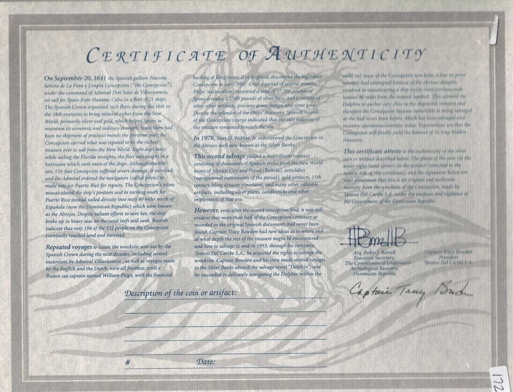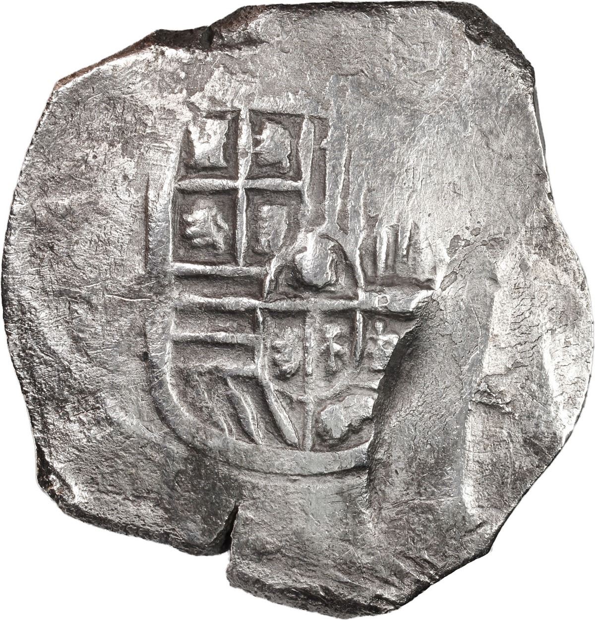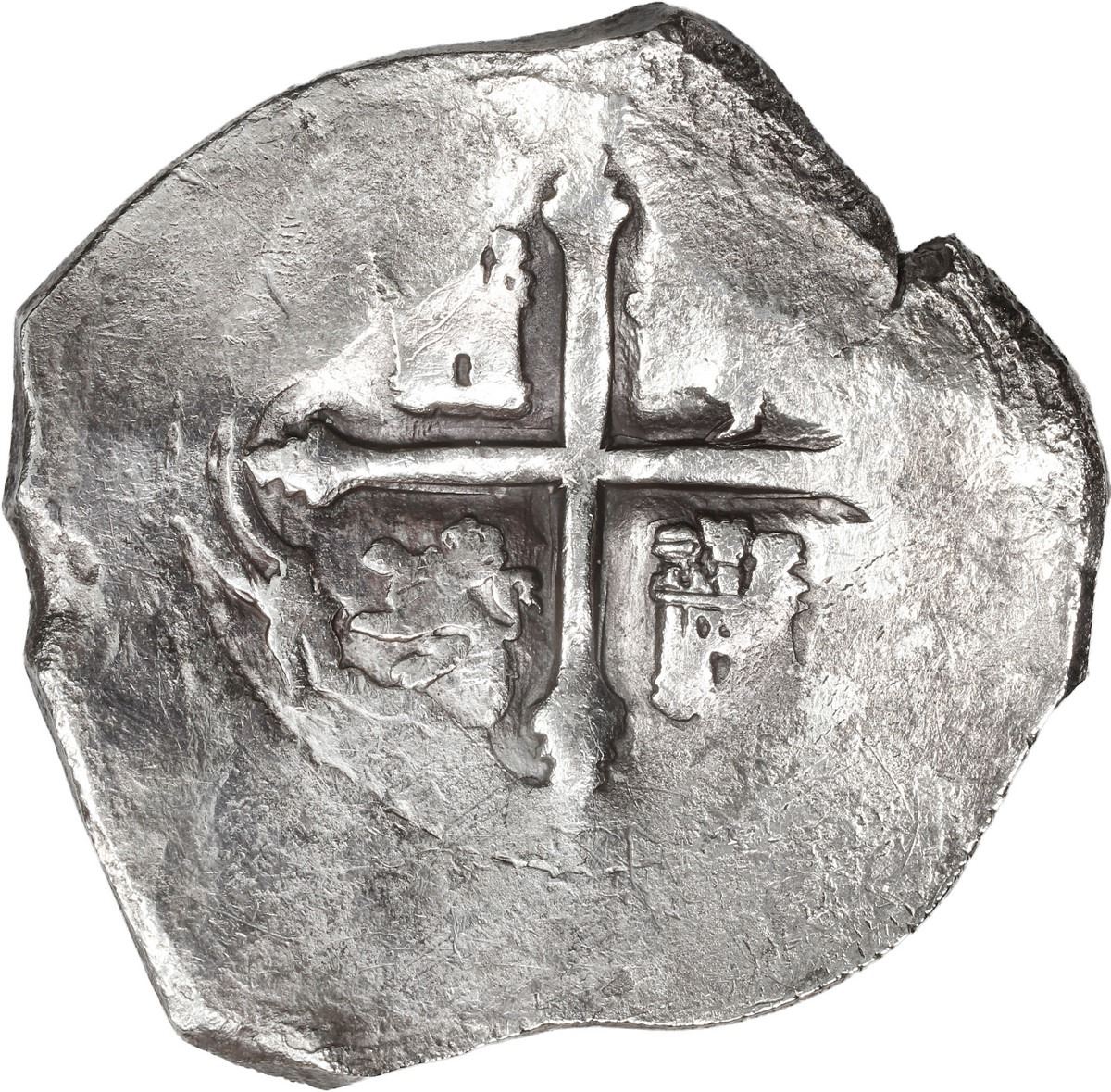 MEXICO, Mexico City, cob 8 reales, Philip IV, assayer not visible (P). S-M19; KM-45; Cal-Type 319. 26.55 grams. Very broad flan with choice full shield and cross but peripheries flat, tiny edge-split, minimal surface corrosion, lightly toned. With original certificate from Captain Tracy Bowden through his contract with the Dominican Republic. Recovered from: Concepción, sunk in 1641 off Hispaniola