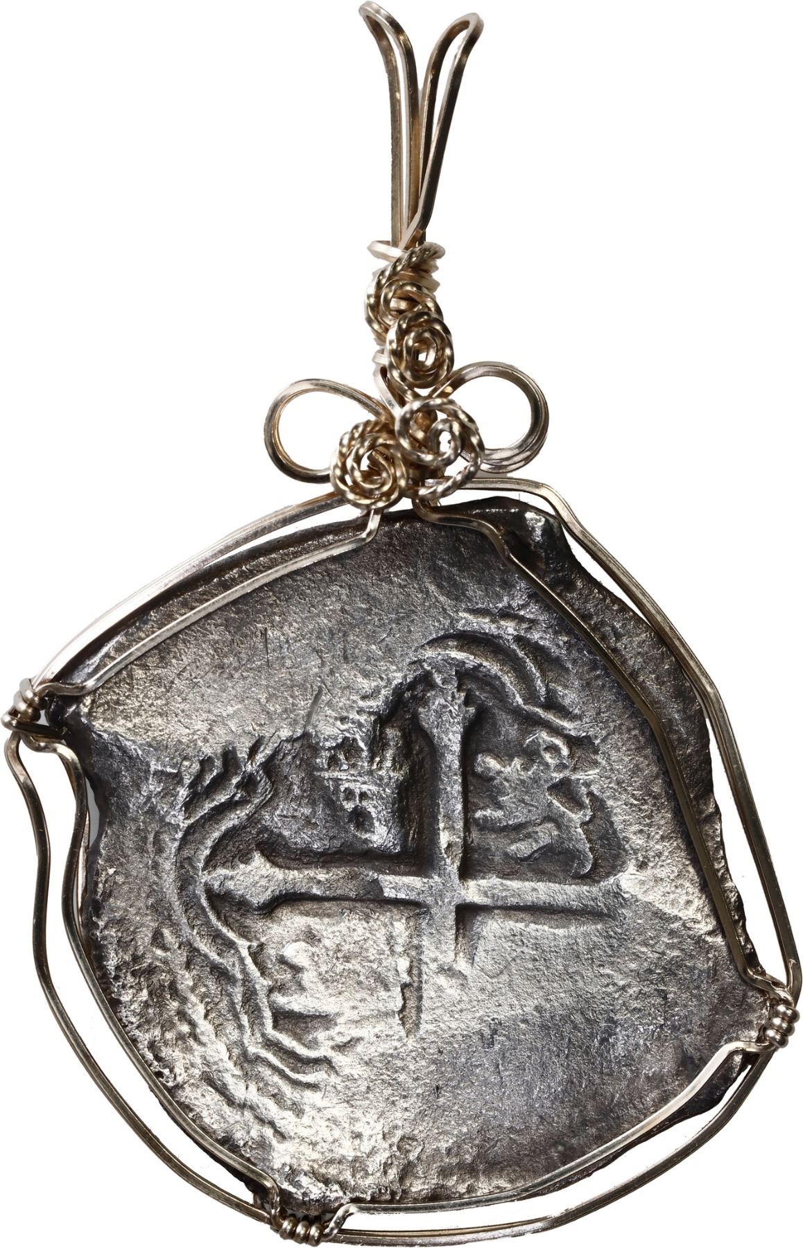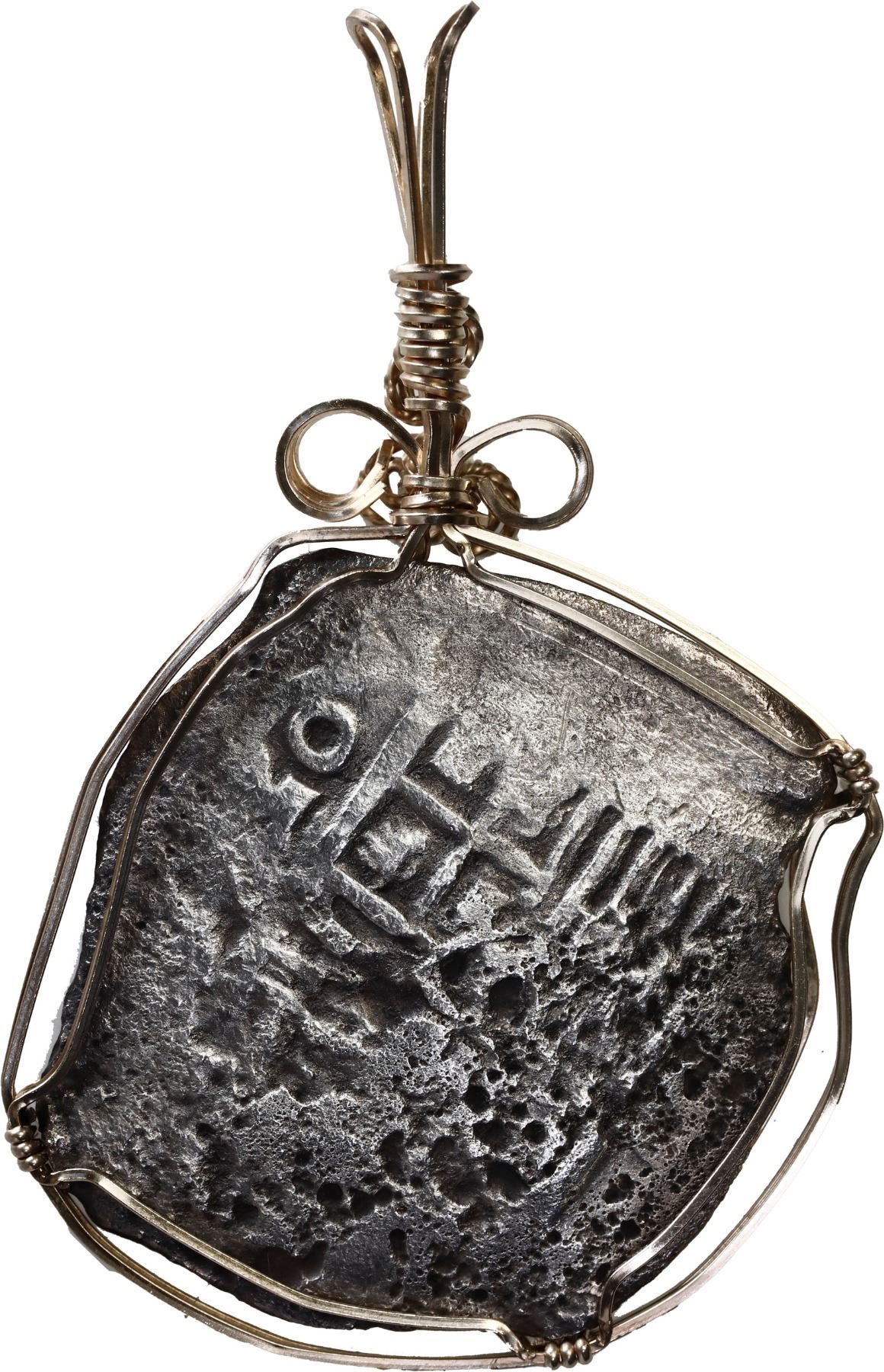 MEXICO, Mexico City, cob 8 reales, Philip IV, assayer not visible, ex-Concepción (1641), mounted cross-side out in 14K gold-wire pendant. 26.22 grams total. Large, solid coin with nice silvery cross side, partial shield with some pitting, clear mintmark, mounted in a neat gold-wire pendant setting. From the Concepción (1641), with original certificate from Captain Tracy Bowden through his contract with the Dominican Republic.