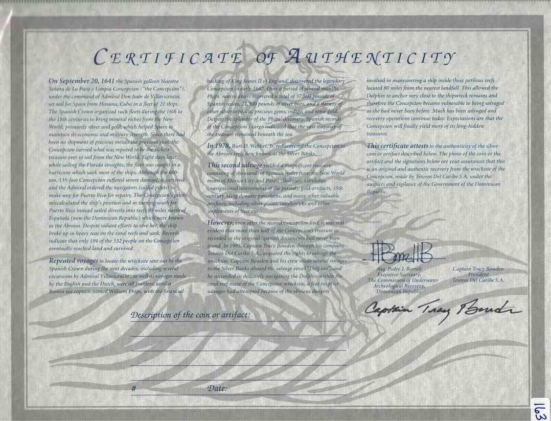 MEXICO, Mexico City, cob 8 reales, Philip IV, assayer not visible. KM-45; Cal-Type 319. 26.94 grams. Solid and corrosion-free but with flat areas from uneven thickness and hammering (as made), some bold shield and cross, nicely toned. With original certificate from Captain Tracy Bowden through his contract with the Dominican Republic. Recovered from: Concepción, sunk in 1641 off Hispaniola