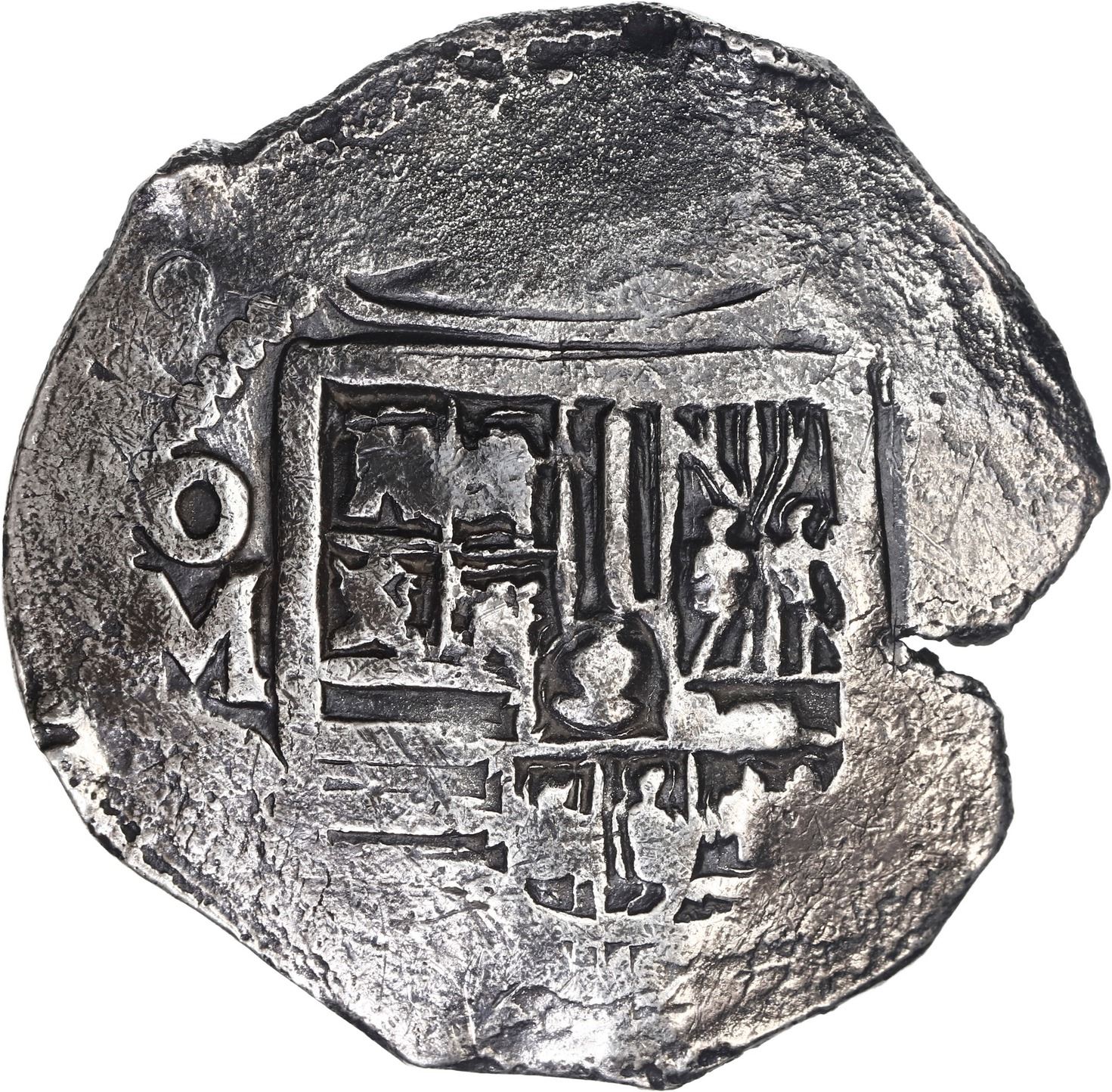 MEXICO, Mexico City, cob 8 reales, Philip IV, assayer not visible. KM-45; Cal-Type 319. 25.82 grams. Round flan with edge-split, flat and uneven peripheries, very bold mintmark oM to left of full shield, full but atypically doubled cross, well toned, minimal surface corrosion. With original certificate from Captain Tracy Bowden through his contract with the Dominican Republic. Recovered from: Concepción, sunk in 1641 off Hispaniola