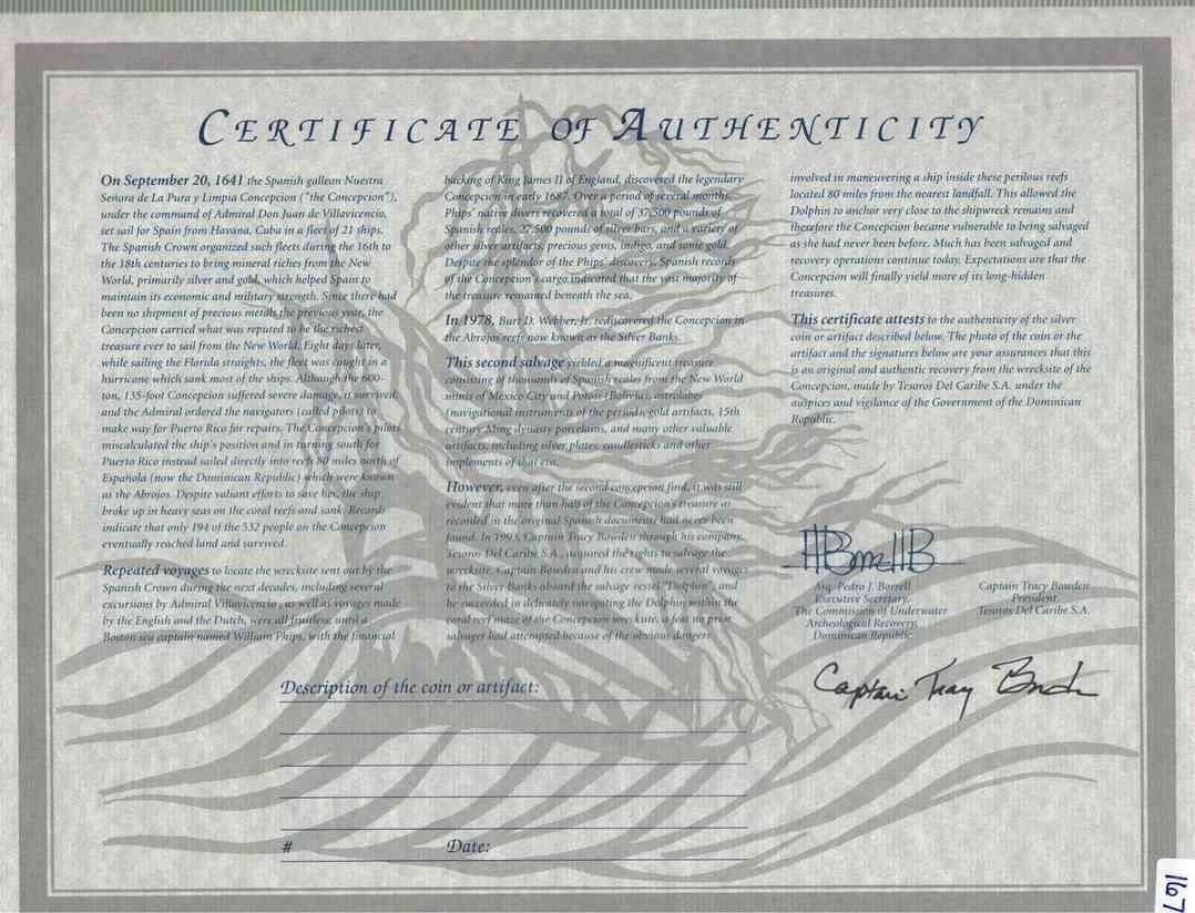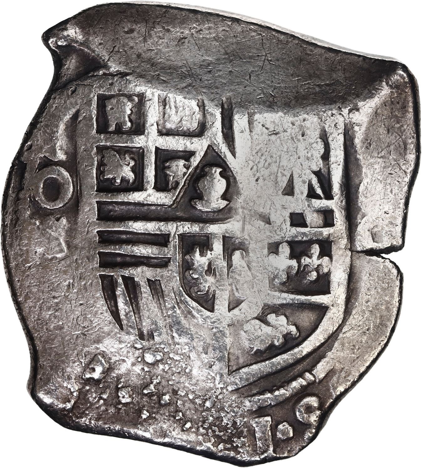 MEXICO, Mexico City, cob 8 reales, Philip IV, assayer not visible. KM-45; Cal-Type 319. 25.65 grams. Bold mintmark oM, good full shield and cross, typical flan with two ends thick and centers thin, lightly toned, traces of localized surface corrosion. With original certificate from Captain Tracy Bowden through his contract with the Dominican Republic. Recovered from: Concepción, sunk in 1641 off Hispaniola