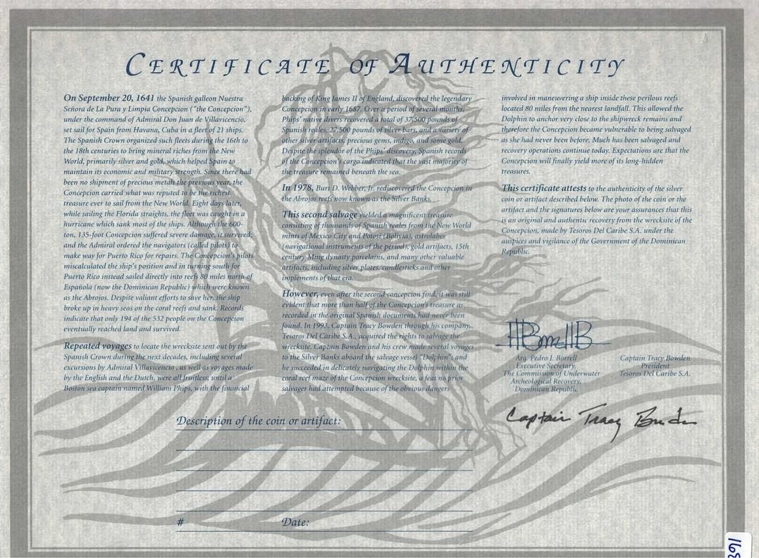 MEXICO, Mexico City, cob 8 reales, Philip IV, assayer not visible. KM-45; Cal-Type 319. 26.76 grams. Broad, roundish flan with bold mintmark oM to left of full shield, full but hammered cross (as made) with flat peripheries from crudely uneven thickness, toned all over, no corrosion. With original certificate from Captain Tracy Bowden through his contract with the Dominican Republic. Recovered from: Concepción, sunk in 1641 off Hispaniola