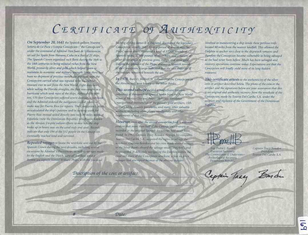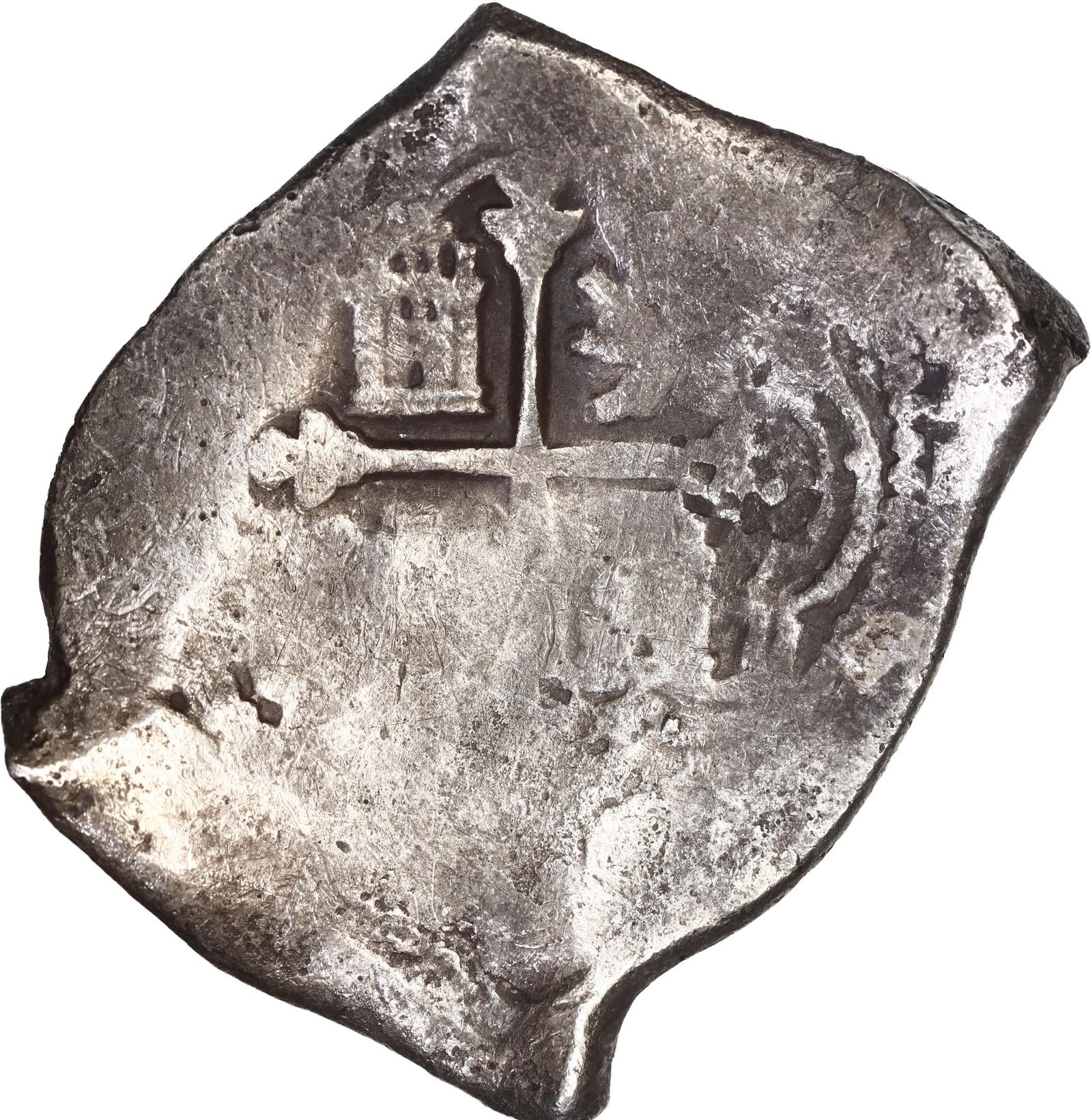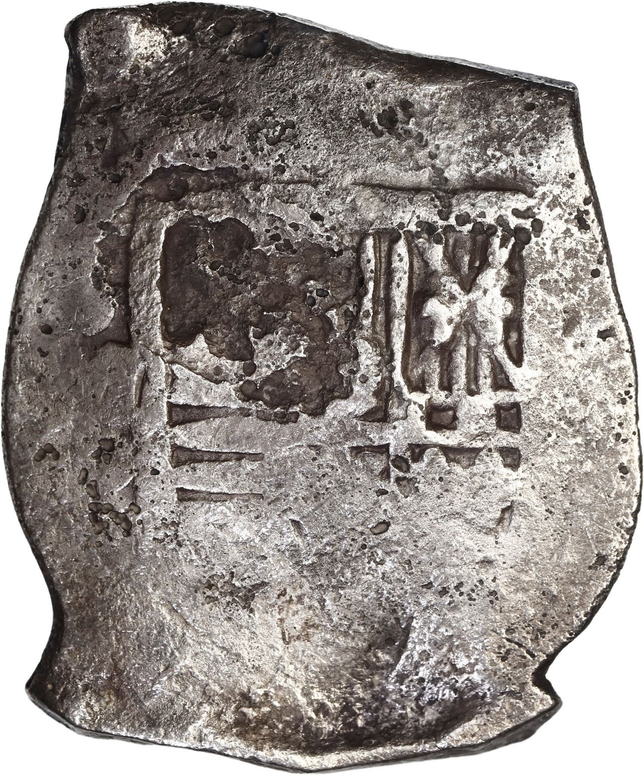 MEXICO, Mexico City, cob 8 reales, Philip IV, assayer not visible. KM-45; Cal-Type 319. 25.31 grams. Curiously rectangular flan with straight top and bottom, flat peripheries, decent cross, some moderate corrosion on shield, light toning. With original certificate from Captain Tracy Bowden through his contract with the Dominican Republic. Recovered from: Concepción, sunk in 1641 off Hispaniola