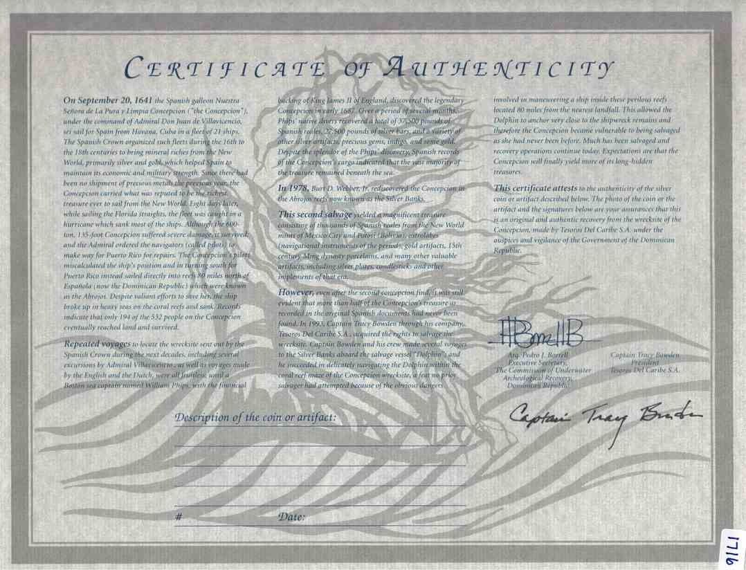 MEXICO, Mexico City, cob 8 reales, Philip IV, assayer not visible. KM-45; Cal-Type 319. 25.68 grams. Nice, solid piece with very minor corrosion around the edges, bold shield and choice full cross, some light graffiti scratches on the reverse. With original certificate from Captain Tracy Bowden through his contract with the Dominican Republic. Recovered from: Concepción, sunk in 1641 off Hispaniola