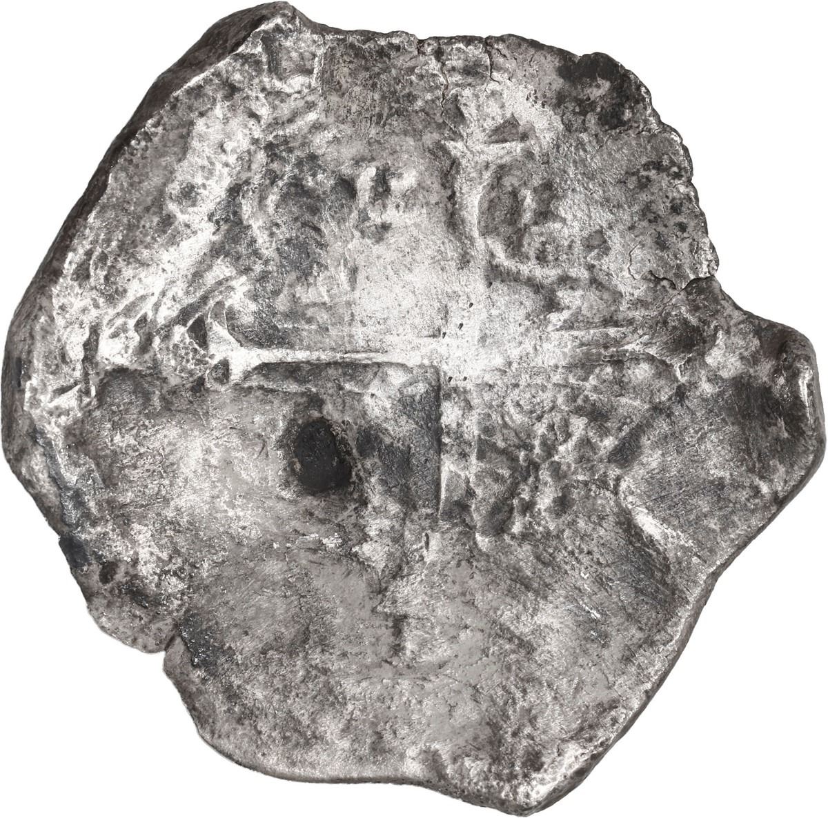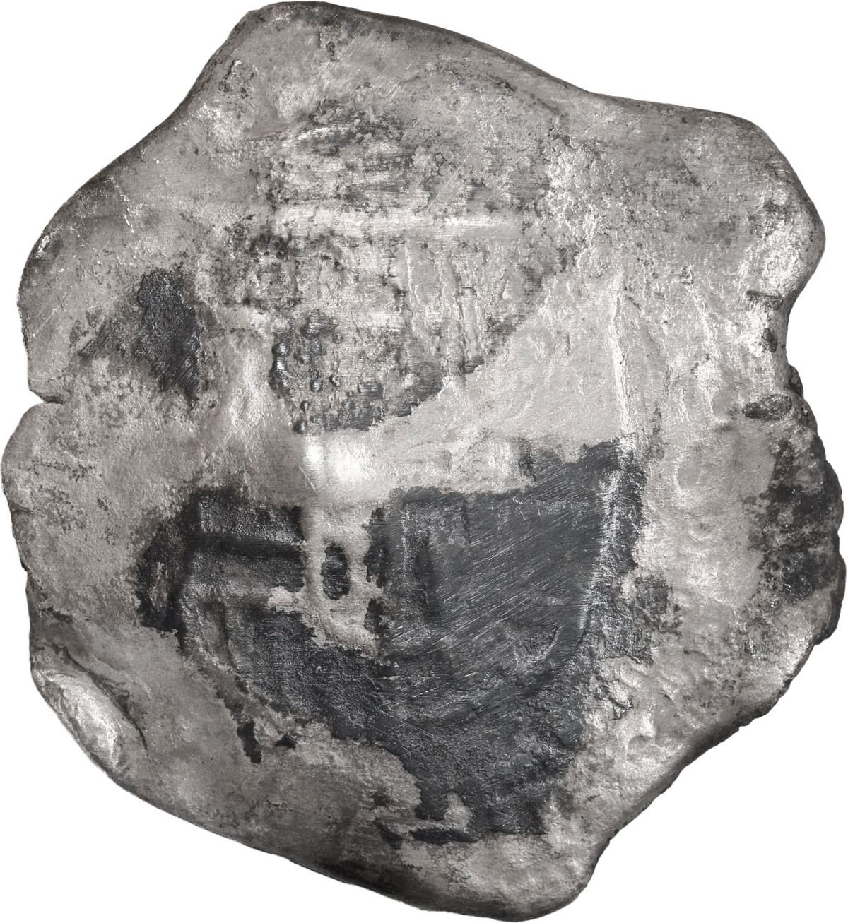MEXICO, Mexico City, cob 8 reales, Philip IV, assayer not visible. KM-45. 22.32 grams. Large, concave, barrel-shaped flan (unevenly thick) with some thinning from corrosion but nearly full shield and cross nonetheless, spotty dark toning, scarce type from this wreck. With original photo-certificate from the salvor. Recovered from: Campen, sunk in 1627 off the Isle of Wight, south of England