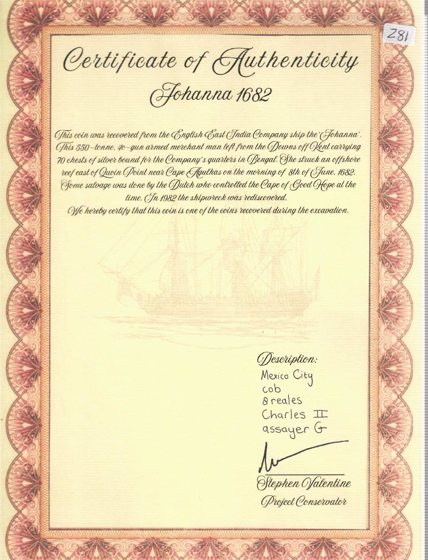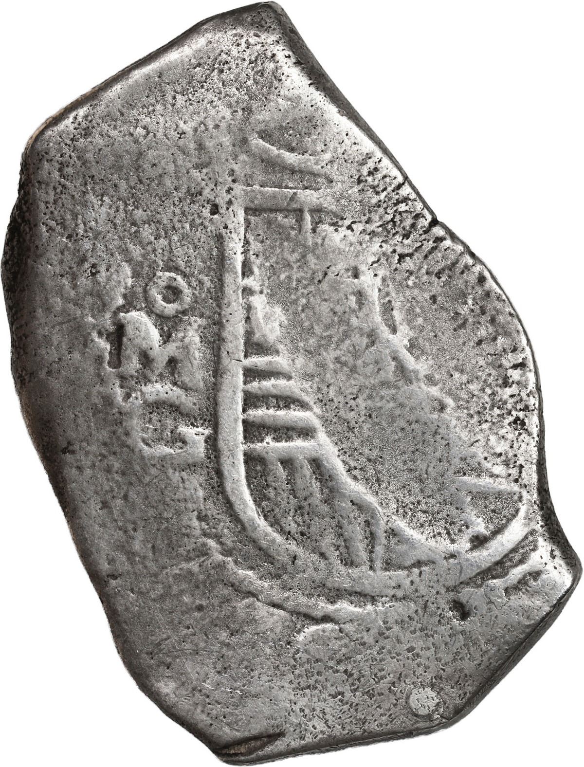 MEXICO, Mexico City, cob 8 reales, Philip IV or Charles II, assayer G. 21.76 grams. Long flan with bold full oMG to left of off-center shield with as-made hammer-mark, full and well-centered cross, worn from corrosion but overall choice for this wreck, lightly toned. Pedigreed to the Steve Valentine Collection, with original certificate from the salvor/conservator. Recovered from: Joanna, sunk in 1682 off South Africa