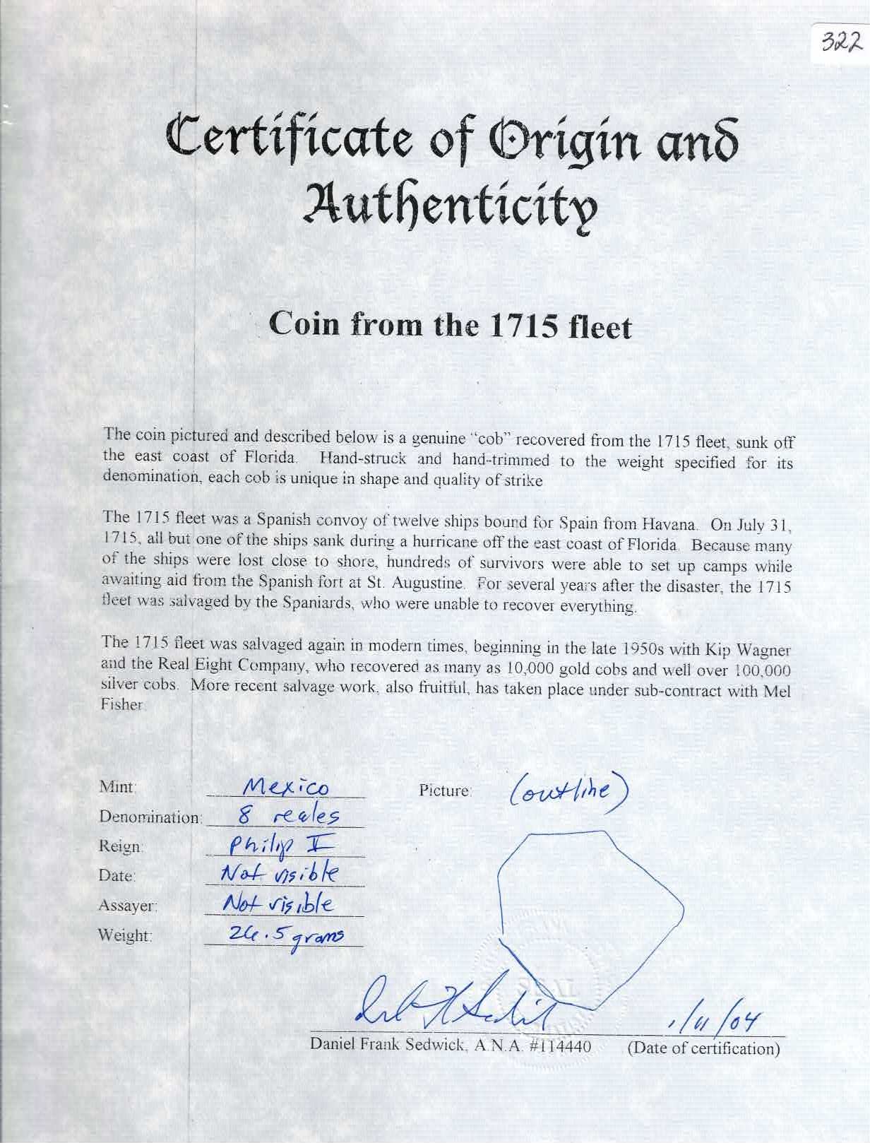 MEXICO, Mexico City, cob 8 reales, Philip V, assayer J, style of 1712-13. S-M22; KM-47; Cal-Type 170. 26.51 grams. Very broad, odd-shaped flan with good full cross and most of shield despite extensive peripheral flatness, minimal surface corrosion, toned in crevices. With Sedwick certificate from 2004. Recovered from: Spanish 1715 Fleet, sunk off the east coast of Florida