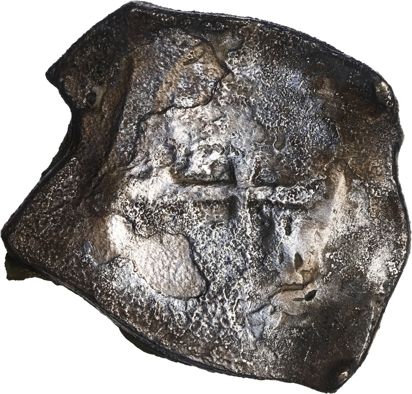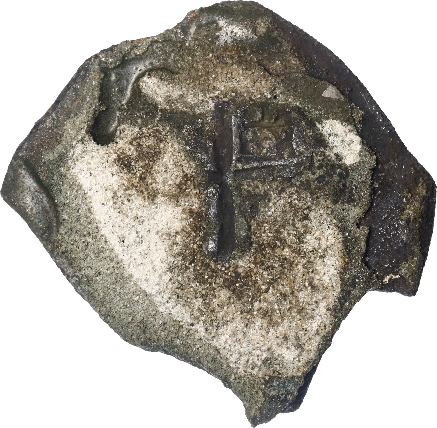 MEXICO, Mexico City, cob 8 reales, Philip V, assayer not visible (J), encrusted with reverse impression of another coin (as found). S-M22; KM-47; Cal-Type 170. 28.81 grams total. Thick, odd-shaped flan with most of cross despite corrosion and light encrustation on that side (dark), the shield side completely covered by white and gray crust bearing the reverse impression of the cross-lions-castles of another coin, fascinating thus. Recovered from: Spanish 1715 Fleet, sunk off the east coast of Florida