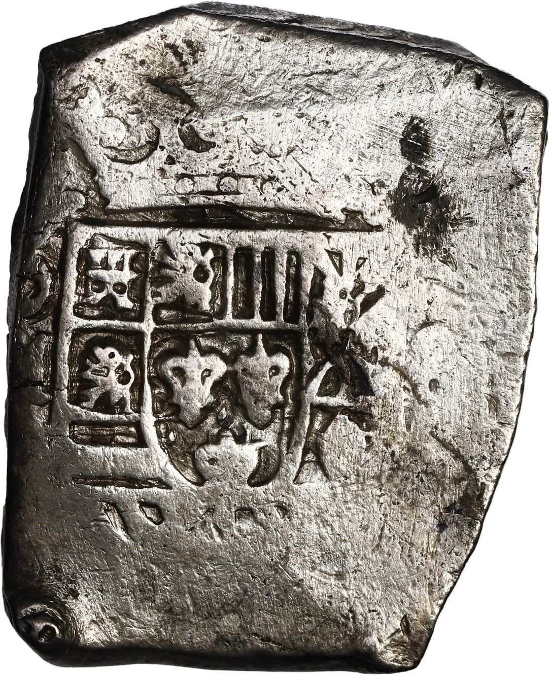 MEXICO, Mexico City, cob 8 reales, Philip V, assayer not visible, style of 1725-33. KM-47; Cal-Type 170. 26.61 grams. Totally corrosion-free on a rectangular flan with two corners blunted, nearly full shield and cross, unusually well centered resulting in the date and mintmark-assayer being off the flan, a few dark spots. With original small envelope AC10886 from the salvors. Recovered from: Rooswijk, sunk in 1739 southeast of England