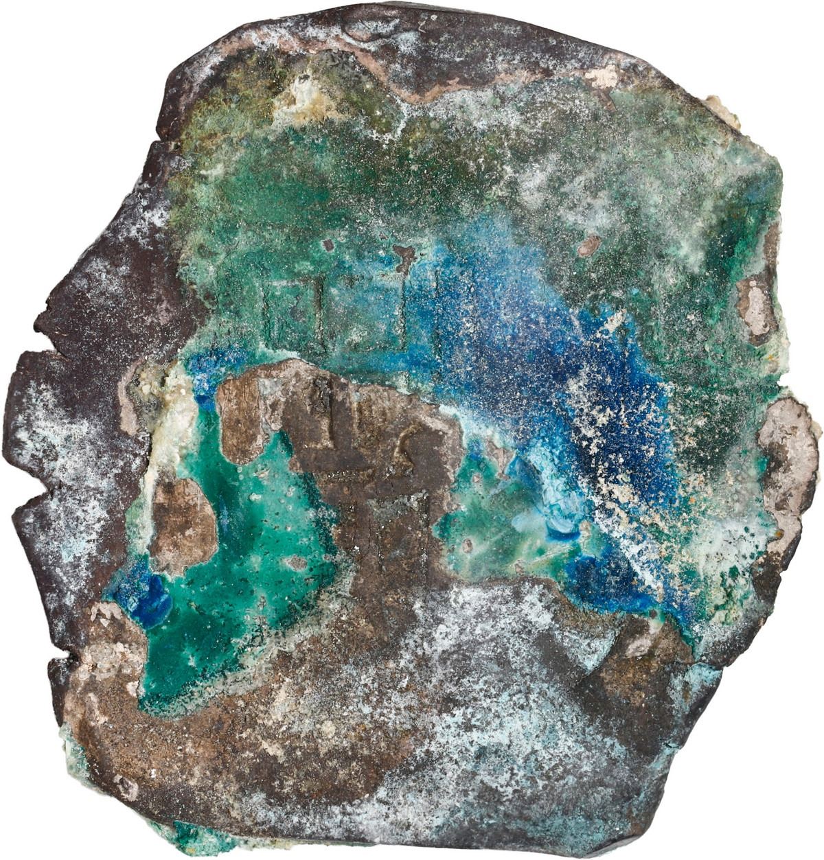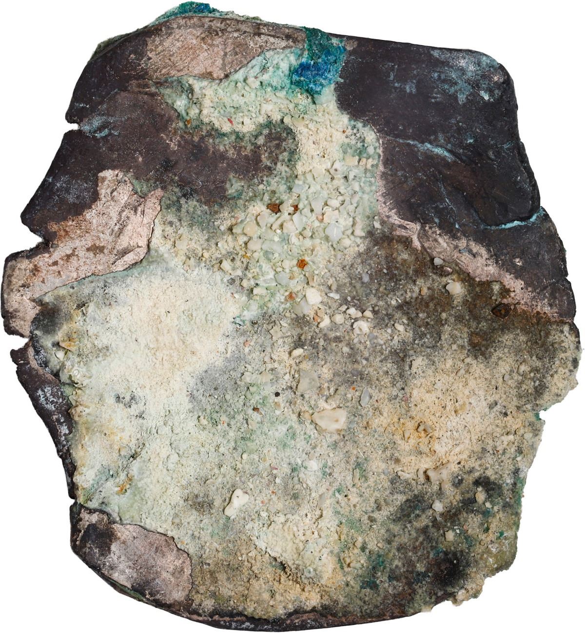 MEXICO, Mexico City, cob 8 reales "greenie," Philip IV, assayer not visible, encrusted as found. KM-45; Cal-Type 319. 27.66 grams total. Typically barrel-shaped flan with all details covered by a thick layer of whitish coral on the cross side and bright green oxidation on the shield side, rather eye-catching. Pedigreed to Sedwick Auction 24, with original lot-tag 1794. Recovered from: Concepción, sunk in 1641 off Hispaniola
