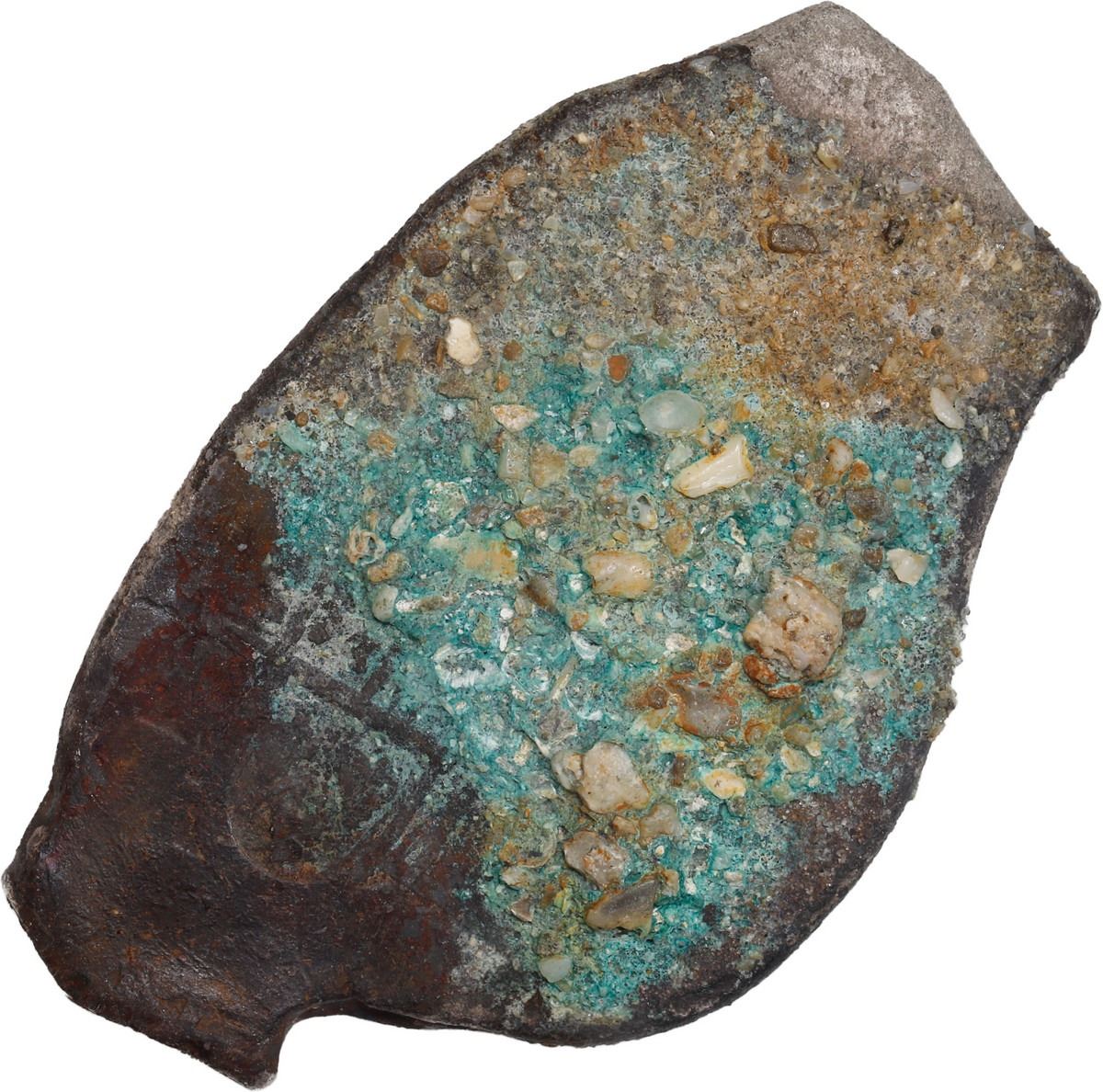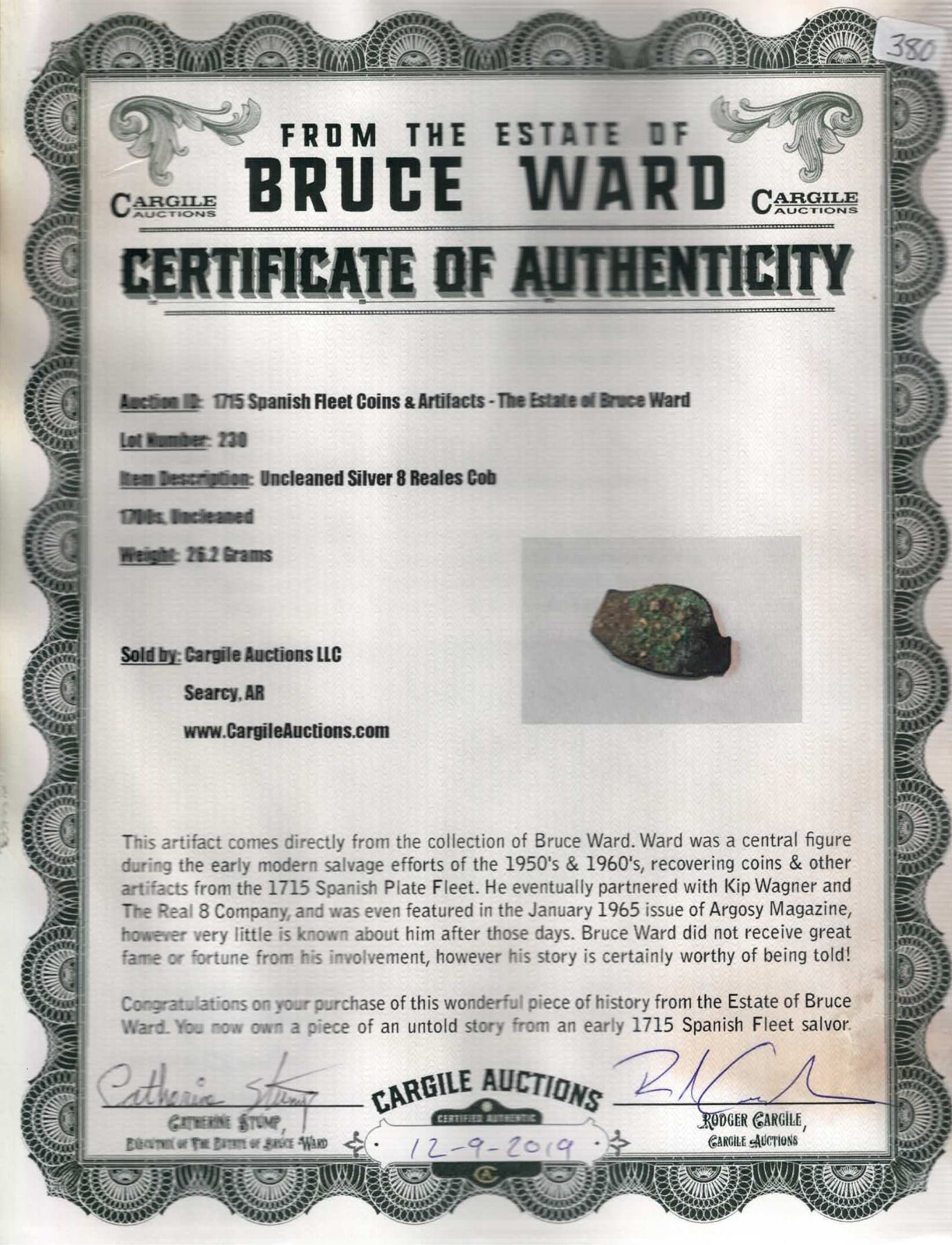 MEXICO, Mexico City, cob 8 reales "greenie," probably Philip V, assayer not visible, half cleaned, ex-Bruce Ward. 25.74 grams total. Long, urn-shaped flan with good full cross visible (lightly corroded) on the cleaned side, the other side with lovely crust of green and tan and tiny shell-bits, very neat. Pedigreed to the Bruce Ward Estate (Cargile auction of December 2019, lot 230), with original photo-certificate and new photo-certificate after partial cleaning. Recovered from: Spanish 1715 Fleet, sunk off the east coast of Florida
