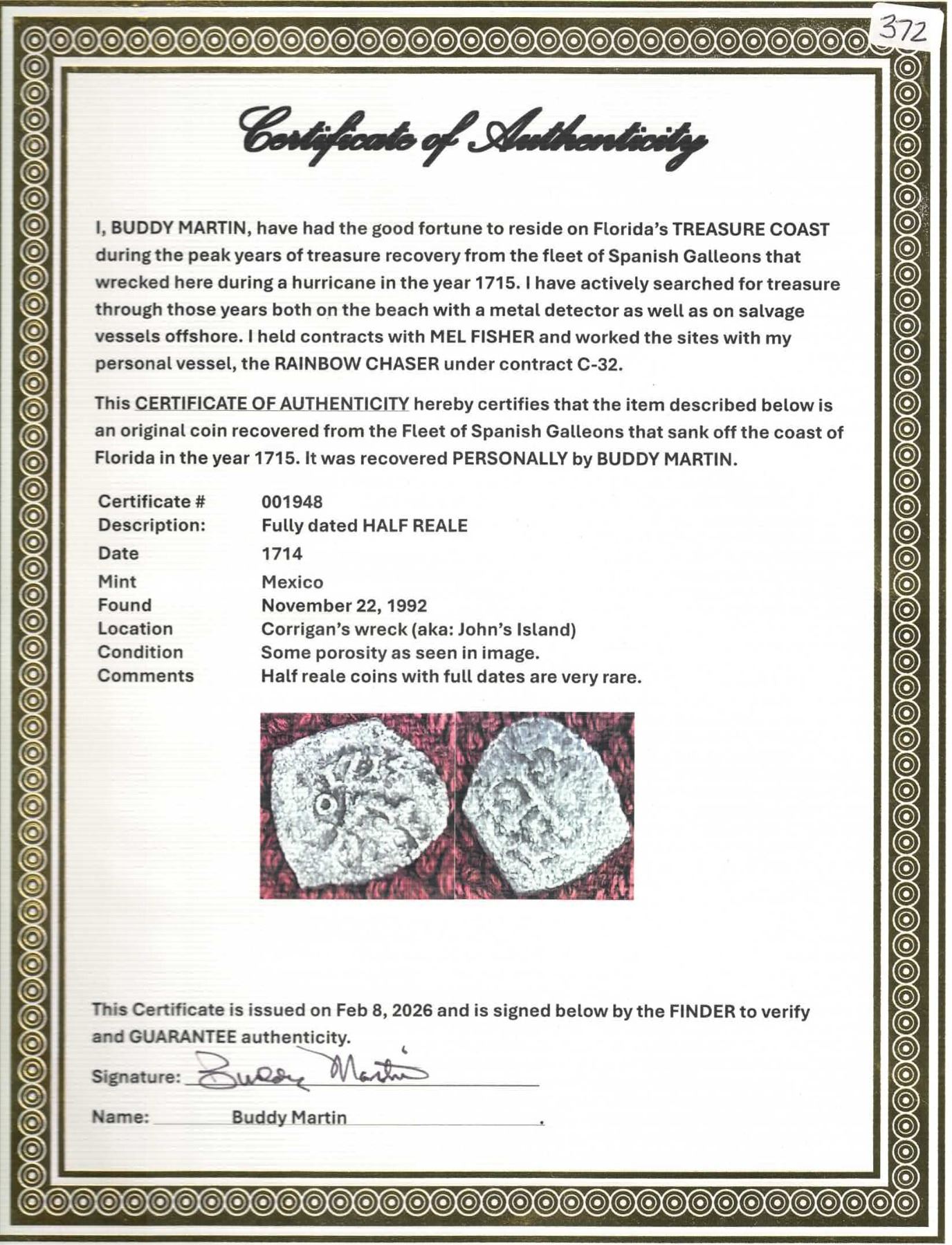 MEXICO, Mexico City, cob ½ real, 1714 J, full date (rare). S-M22; KM-24; Cal-223. 1.58 grams. A decent shipwreck ½R is a rare occurrence anyway, but to find one like this with 100% full and bold date (due to off-center obverse) is nothing short of miraculous! The oM mintmark is also visible, and the well-centered cross is nearly full, but all a bit corroded. From the Corrigan's site, recovered in 1992, with photo-certificate from the finder (Buddy Martin). Recovered from: Spanish 1715 Fleet, sunk off the east coast of Florida