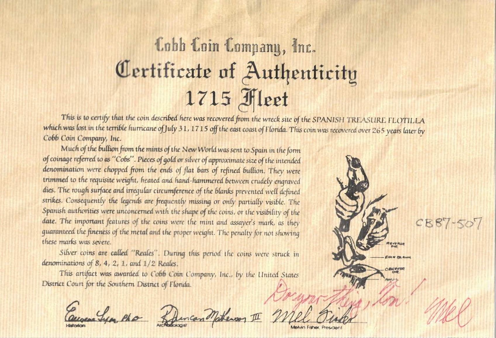 MEXICO, Mexico City, cob ½ real, Charles II or Philip V, assayer not visible, ex-Fisher. 0.70 gram. Dark and thin piece from heavy corrosion. With original Cobb Coin Co. (Fisher) certificate hand-signed by Mel Fisher with the dedication "Do your thing, Tom!". Recovered from: Spanish 1715 Fleet, sunk off the east coast of Florida