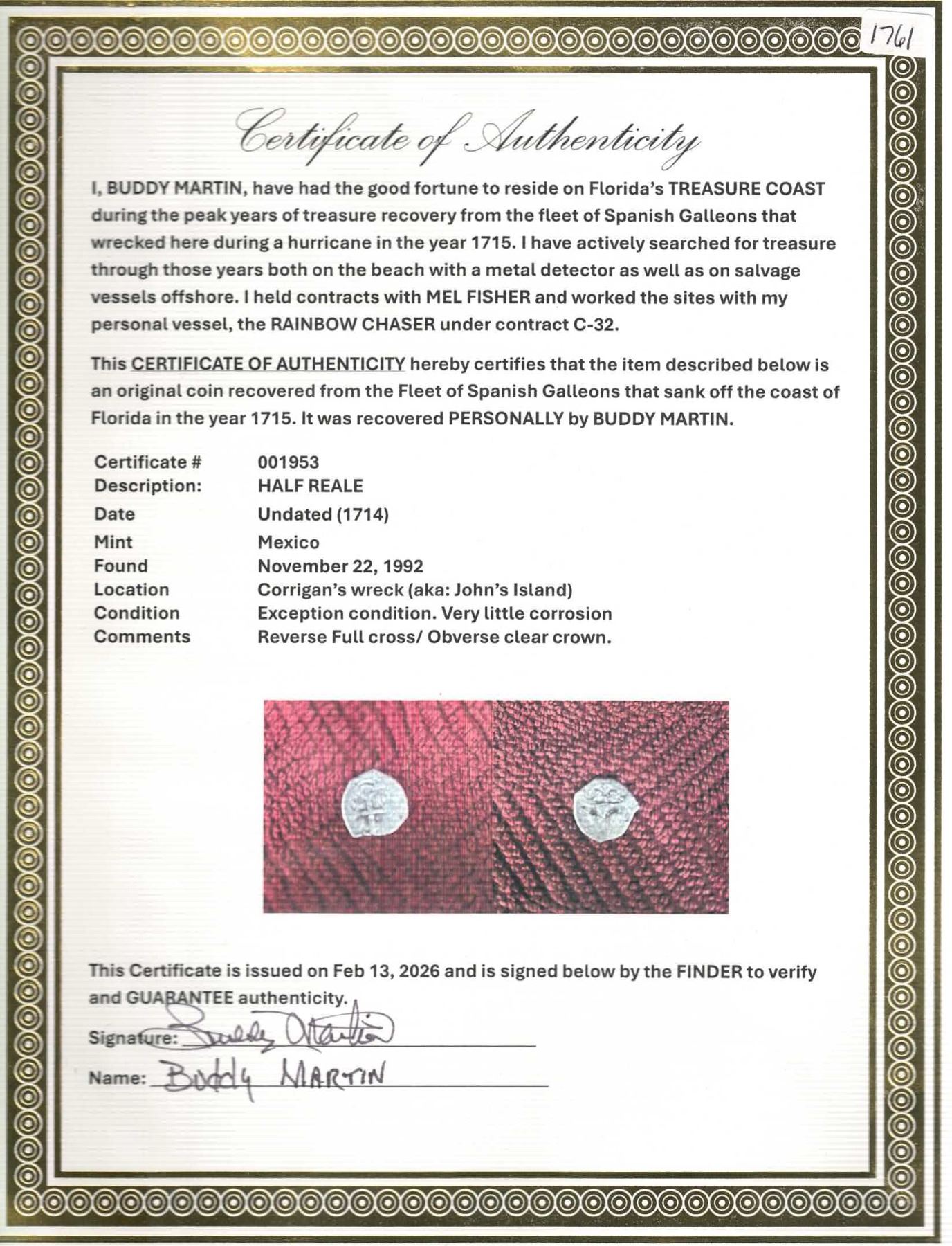 MEXICO, Mexico City, cob ½ real, Philip V, assayer not visible. KM-24; Cal-Type 52. 1.58 grams. Quite nice with a choice full crown plus a very nicely detailed cross, minimal surface corrosion, tough denomination to find from the Fleet in this quality. From the Corrigan's site (found in 1992), with photo-certificate from the finder (Buddy Martin). Recovered from: Spanish 1715 Fleet, sunk off the east coast of Florida