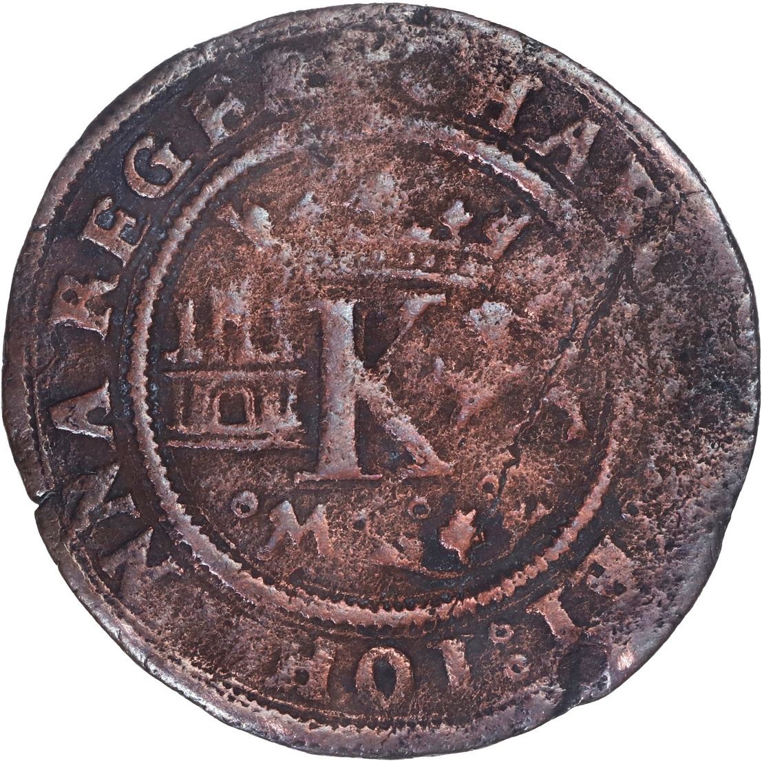 MEXICO, Mexico City, copper 4 maravedís, Charles-Joanna, no assayer (period of assayer G), king's name as CHAROLVS. Nesmith-6; Cal-26; KM-unl. 6.04 grams. Broad flan extending past outer border in places, full inner details (save for a couple weak spots), VF with typical light surface corrosion, odd diagonal surface crack across lion, lots of copper color with a few spots of dark toning.