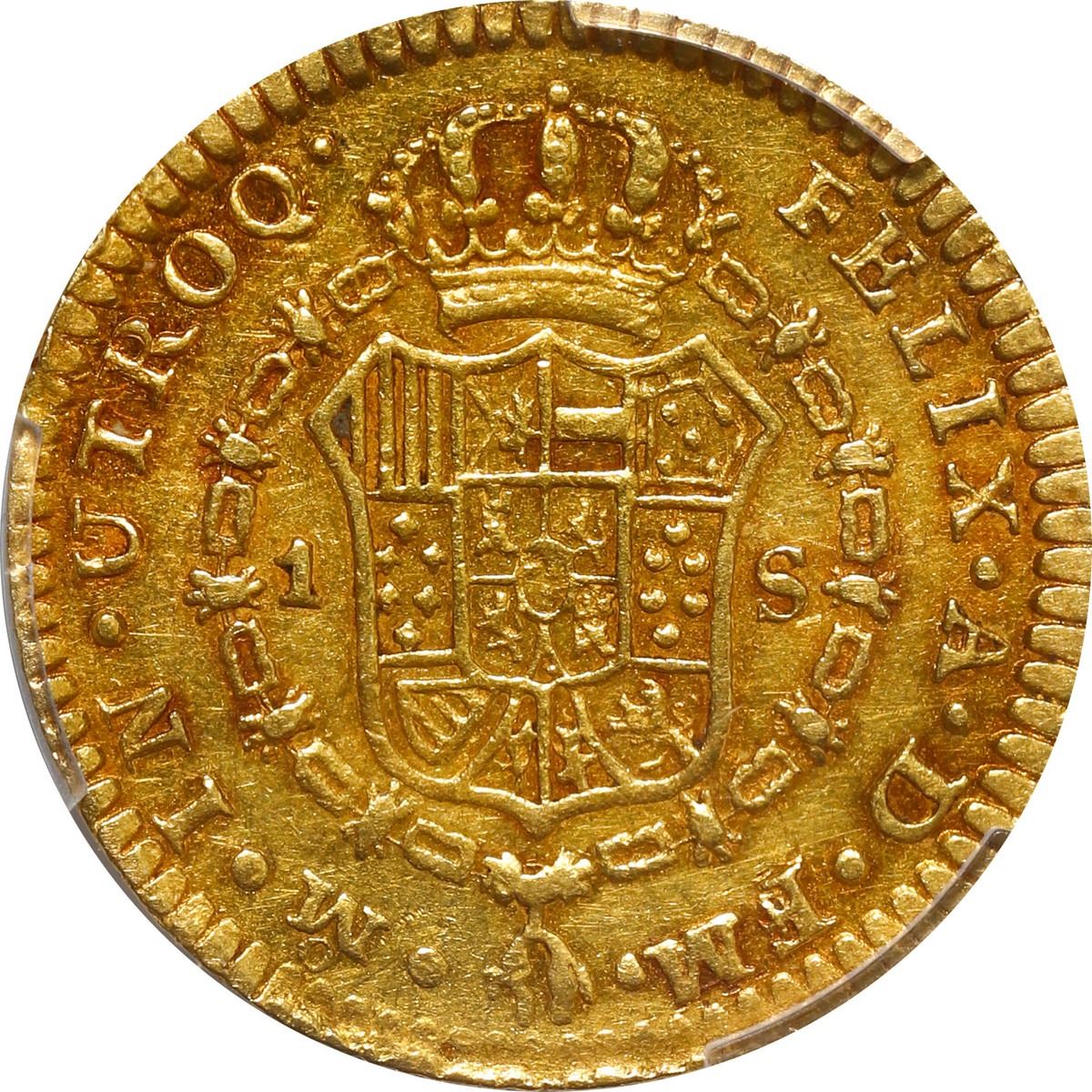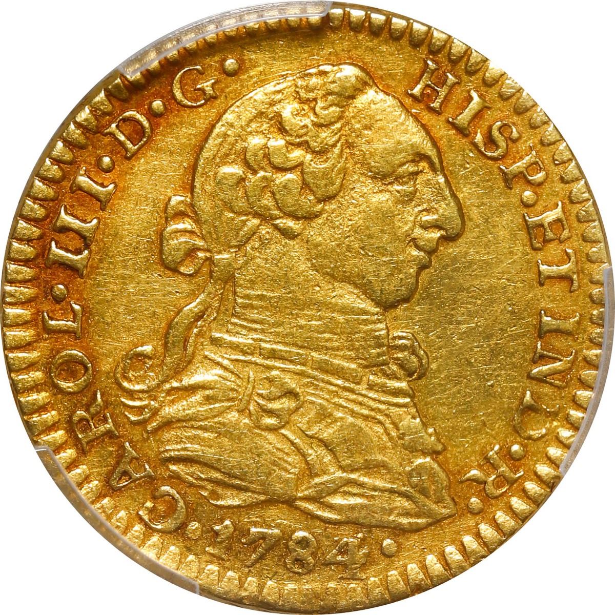 MEXICO, Mexico City, gold bust 1 escudo, Charles III, 1784/3 FM/FF, PCGS AU details / scratch. Cal-1403; KM-118.2; Fr-36. Sharp details and full rims, muted luster, light red toning in legends, one staple scratch in front of neck, scarce overdate and over-assayer that is FM/FF and not FM/F as stated on the label.