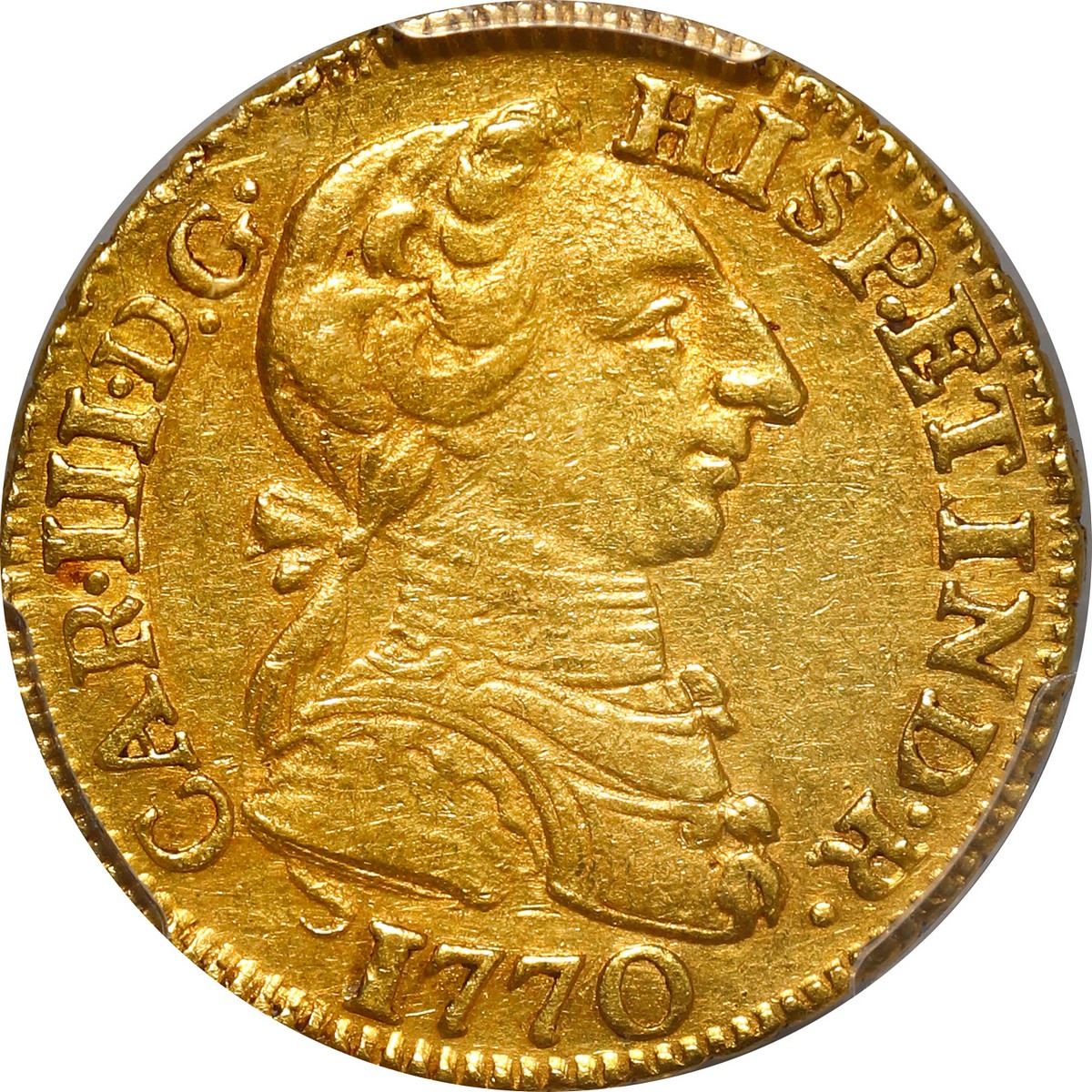 MEXICO, Mexico City, gold bust 1 escudo, Charles III ("rat nose" bust), 1770 MF, rare, PCGS AU50, finest and only example in PCGS census. Cal-1385; KM-117; Fr-32. Bold full details including rims, muted luster with minimal toning, choice example of this rare second ("rat nose") Charles III bust design, and the finest of this date at either PCGS or NGC (none in Mint State).