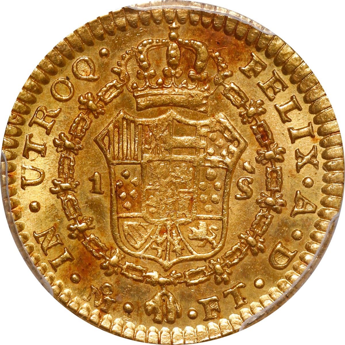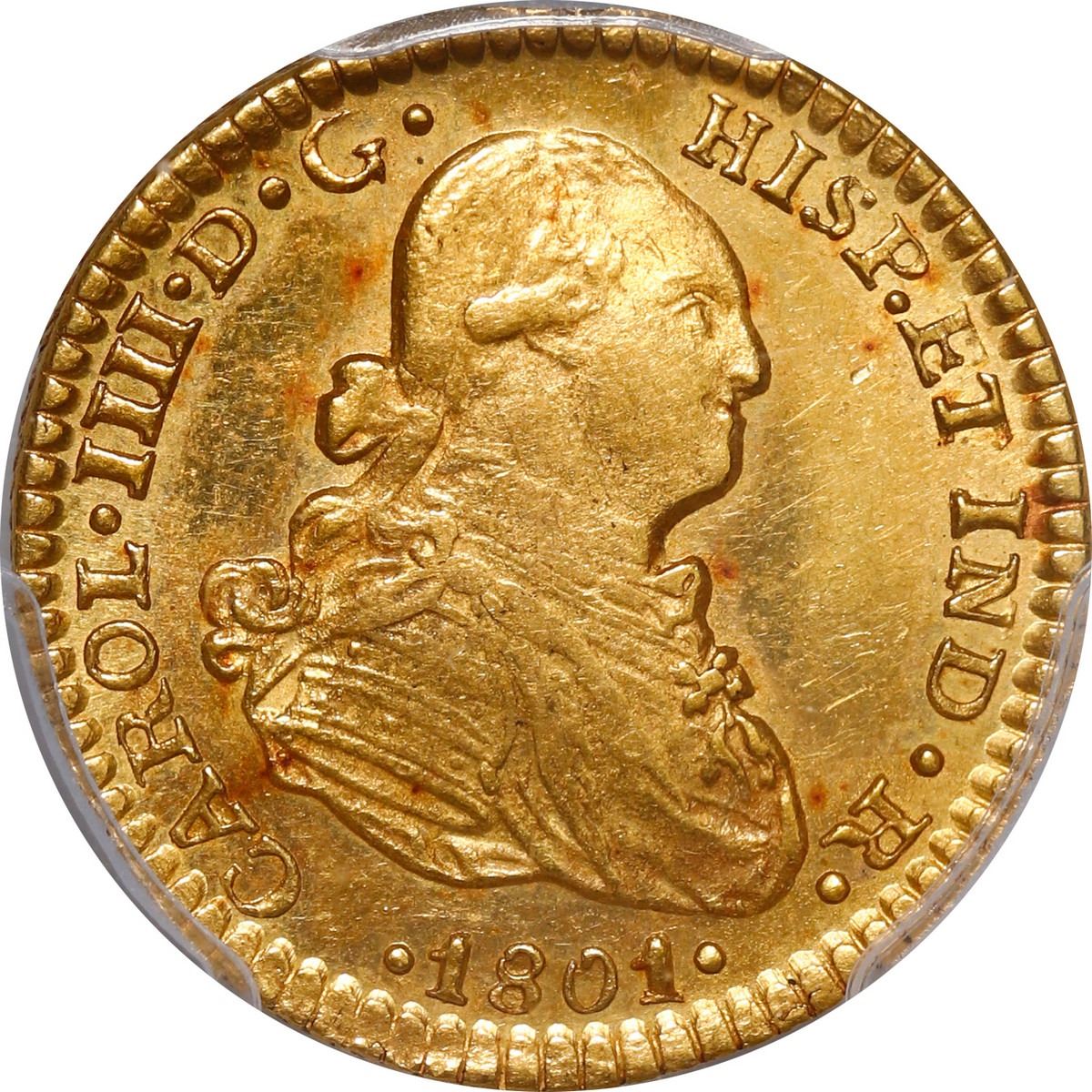 MEXICO, Mexico City, gold bust 1 escudo, Charles IV, 1801 FT, PCGS AU58. Cal-1133; KM-120; Fr-46. Choice luster and bold full details including rims, small red patches and slightly weak center on reverse.