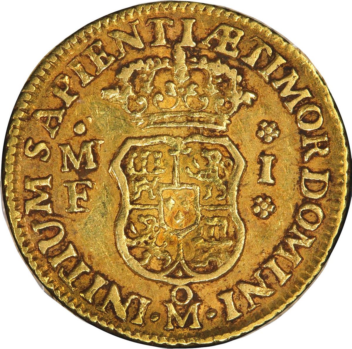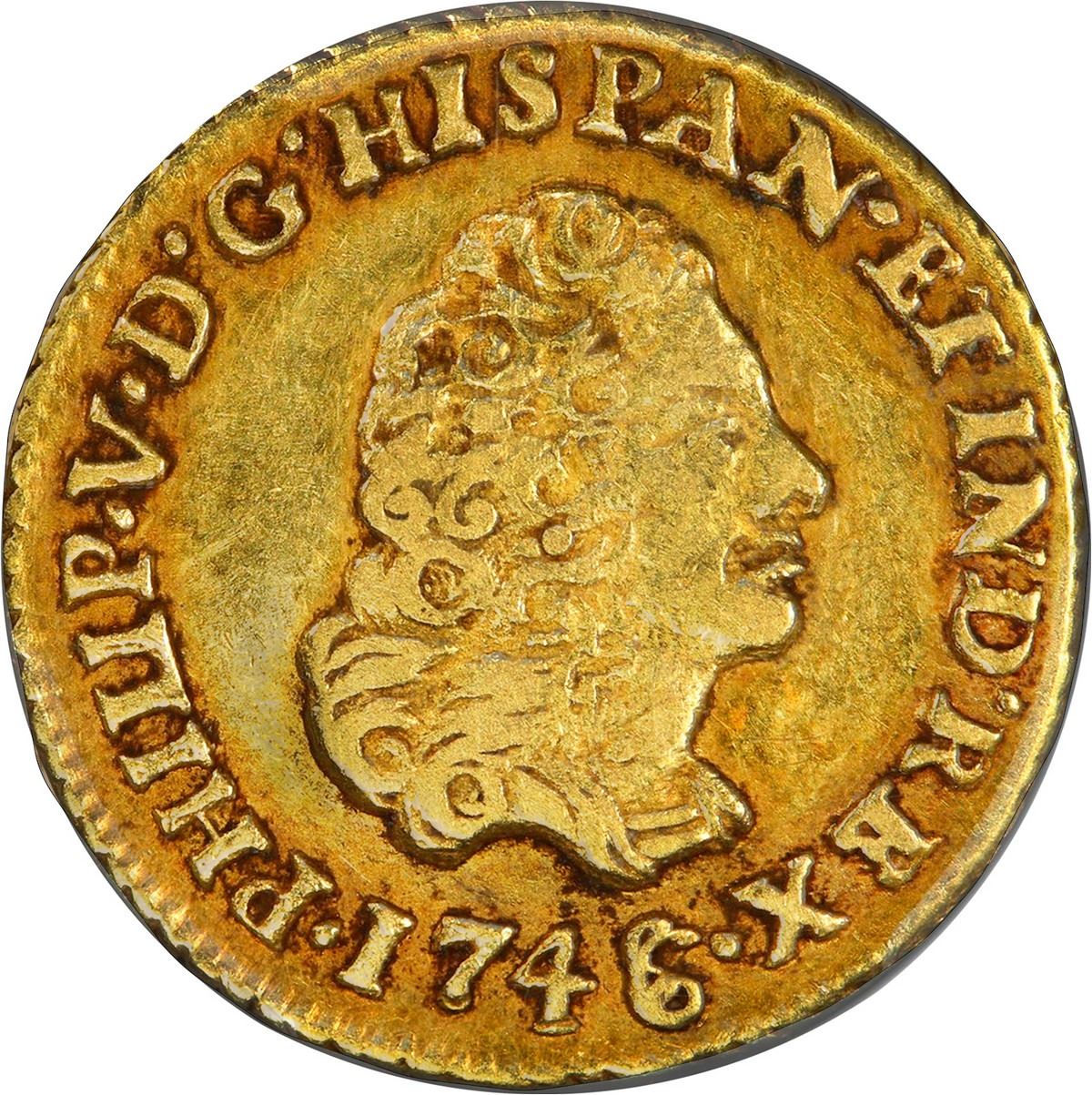 MEXICO, Mexico City, gold bust 1 escudo, Philip V, 1746/5 MF, PCGS XF45, finest and only example in PCGS census. Cal-1767; KM-113; Fr-11. Bold strike with contrasting toning in legends, muted luster on fields, trace of die-buckling on obverse, scarce type and overdate, this example the finest known at PCGS with just one finer at NGC in AU 53 (none in Mint State).