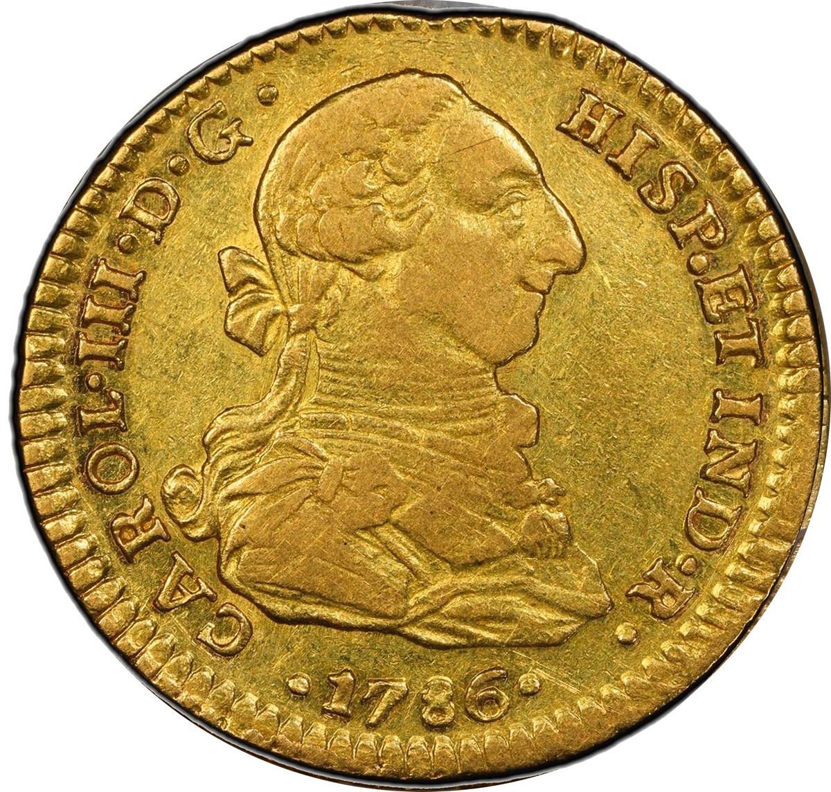 MEXICO, Mexico City, gold bust 2 escudos, Charles III, 1786 FM, PCGS XF45. Cal-1611; KM-130.2a; Fr-35. Light yellow color, broad flan with full rims, bright luster throughout (looks AU), second finest in PCGS census behind a single AU 53 (one finer at NGC, none in Mint State).