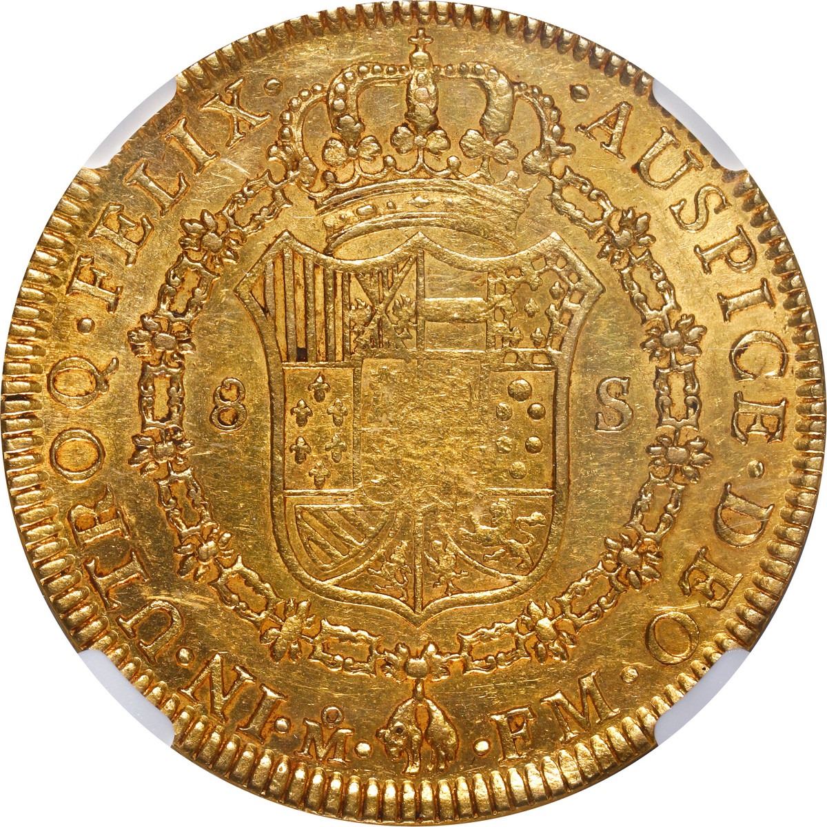 MEXICO, Mexico City, gold bust 8 escudos, Charles III, 1788 FM, mintmark and assayer upright, NGC AU 55. Cal-2000; KM-156.1a; Fr-33. Broad flan with full rims, decent luster for the assigned grade, slightly weakly struck in centers.