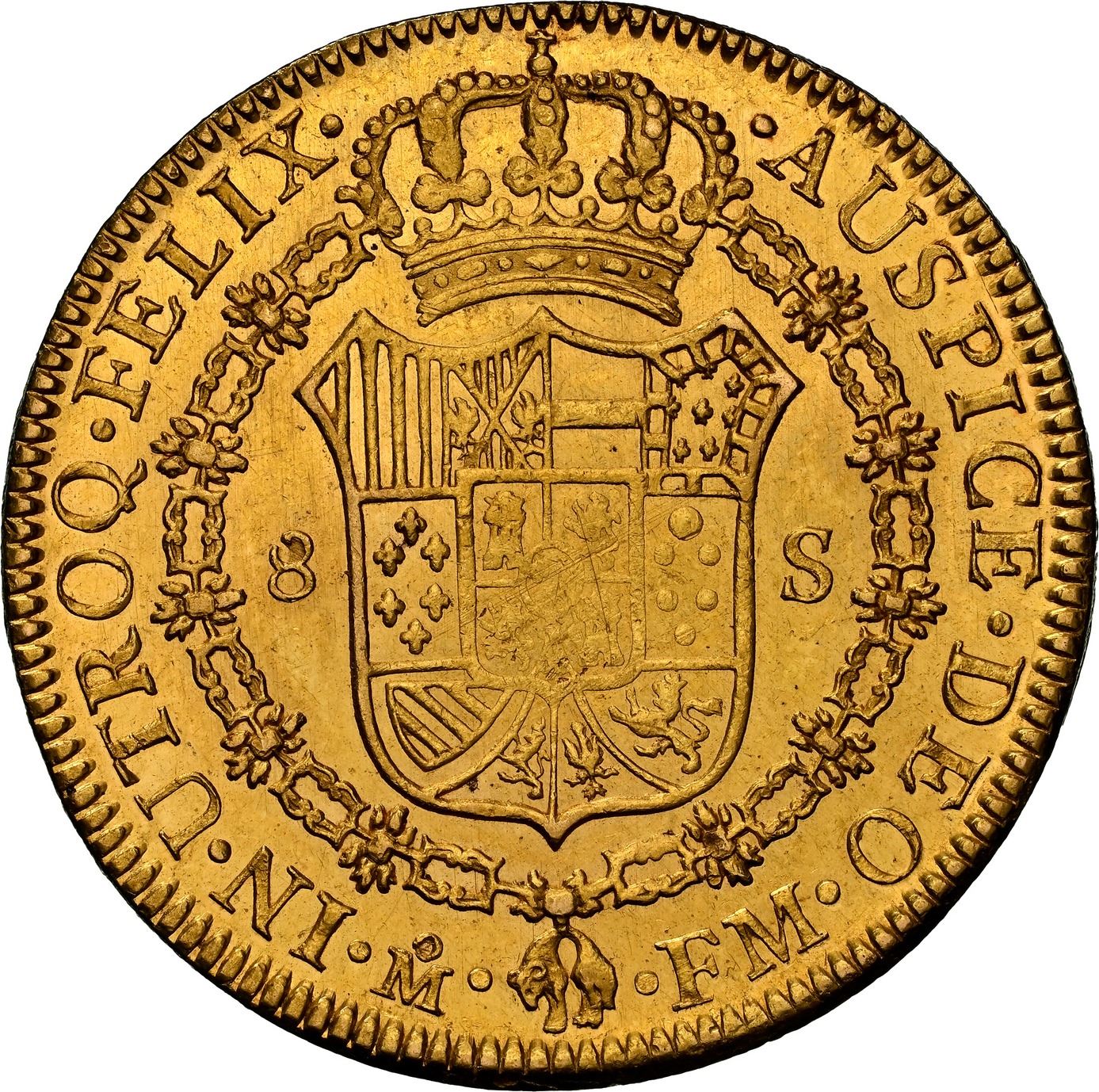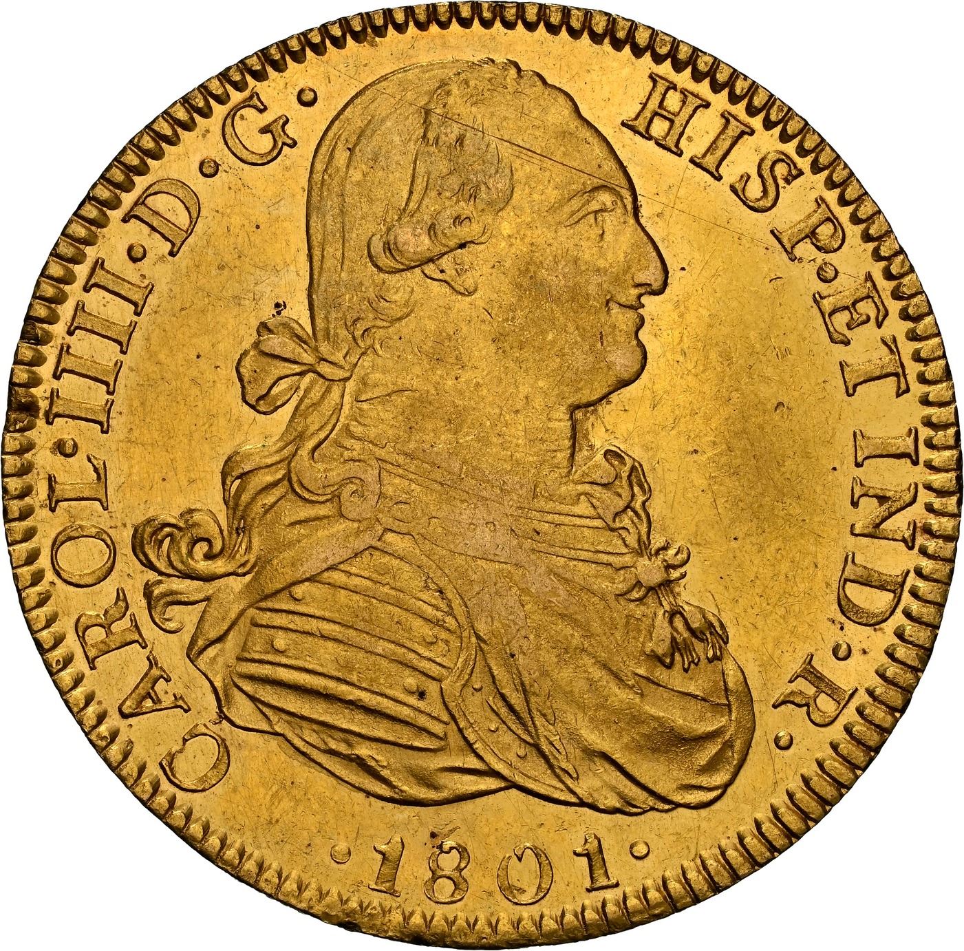 MEXICO, Mexico City, gold bust 8 escudos, Charles IV, 1801 FM, NGC AU details / obv cleaned. Cal-1643; KM-159; Fr-43. Sharp, high AU details with particularly defined bust and great luster, scattered surface hairlines in the obverse fields.