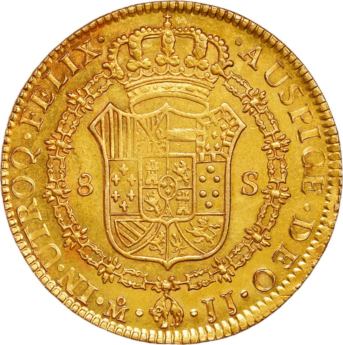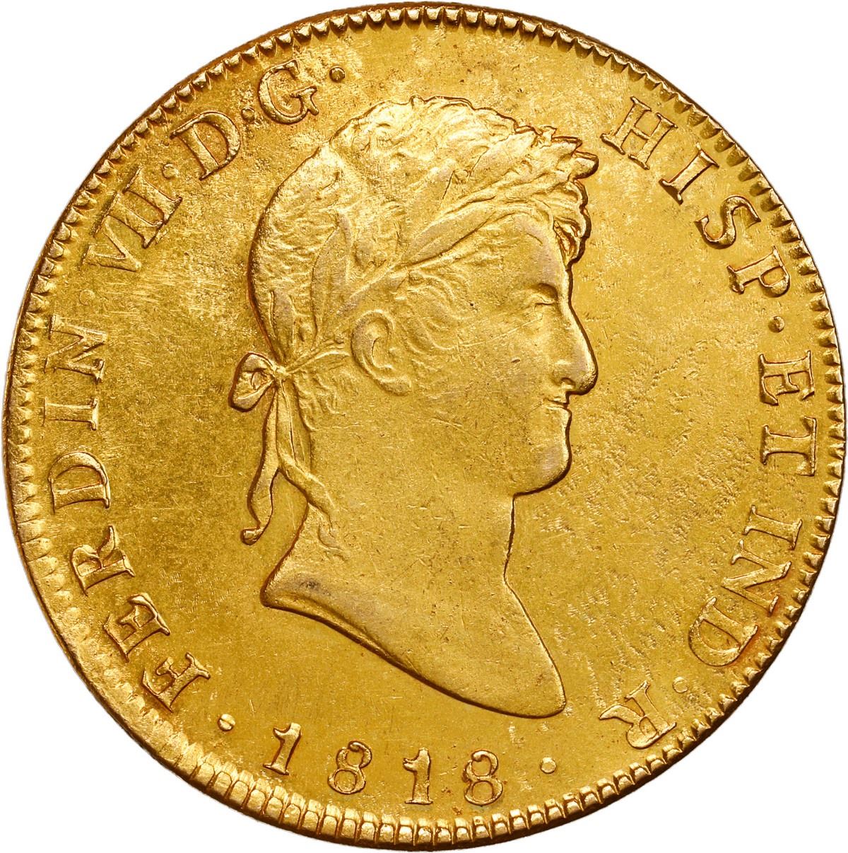 MEXICO, Mexico City, gold bust 8 escudos, Ferdinand VII, 1818 JJ. KM-161; Cal-1797; Fr-52. 27.01 grams. AU with very faint surface pitting on the obverse while the reverse remains very lustrous and original, traces of light red toning.