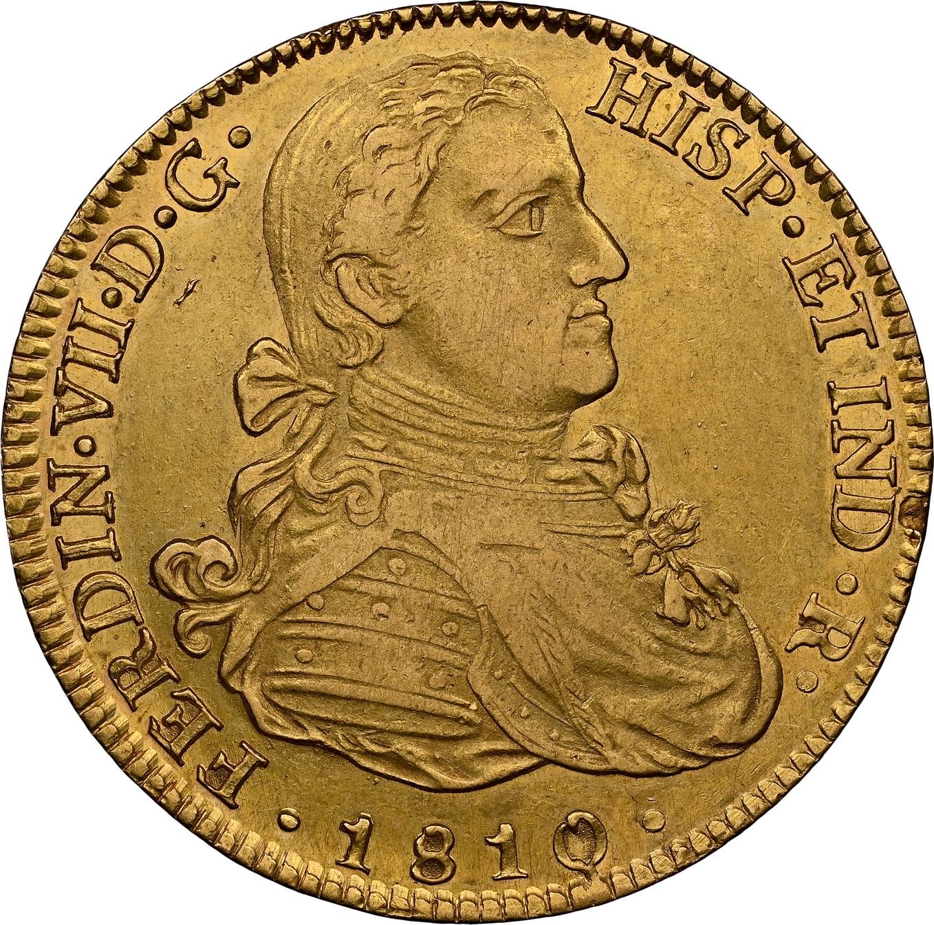 MEXICO, Mexico City, gold bust 8 escudos, Ferdinand VII transitional (armored bust), 1810 HJ, NGC AU 53. KM-160; Cal-1783; Fr-47. Good luster and nice surfaces despite mild high-point wear and slightly weak centers.
