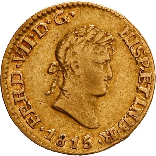MEXICO, Mexico City, gold bust ½ escudo, Ferdinand VII, 1815 JJ. Cal-1489; KM-112; Fr-57. 1.65 grams. VF with light hairlines.