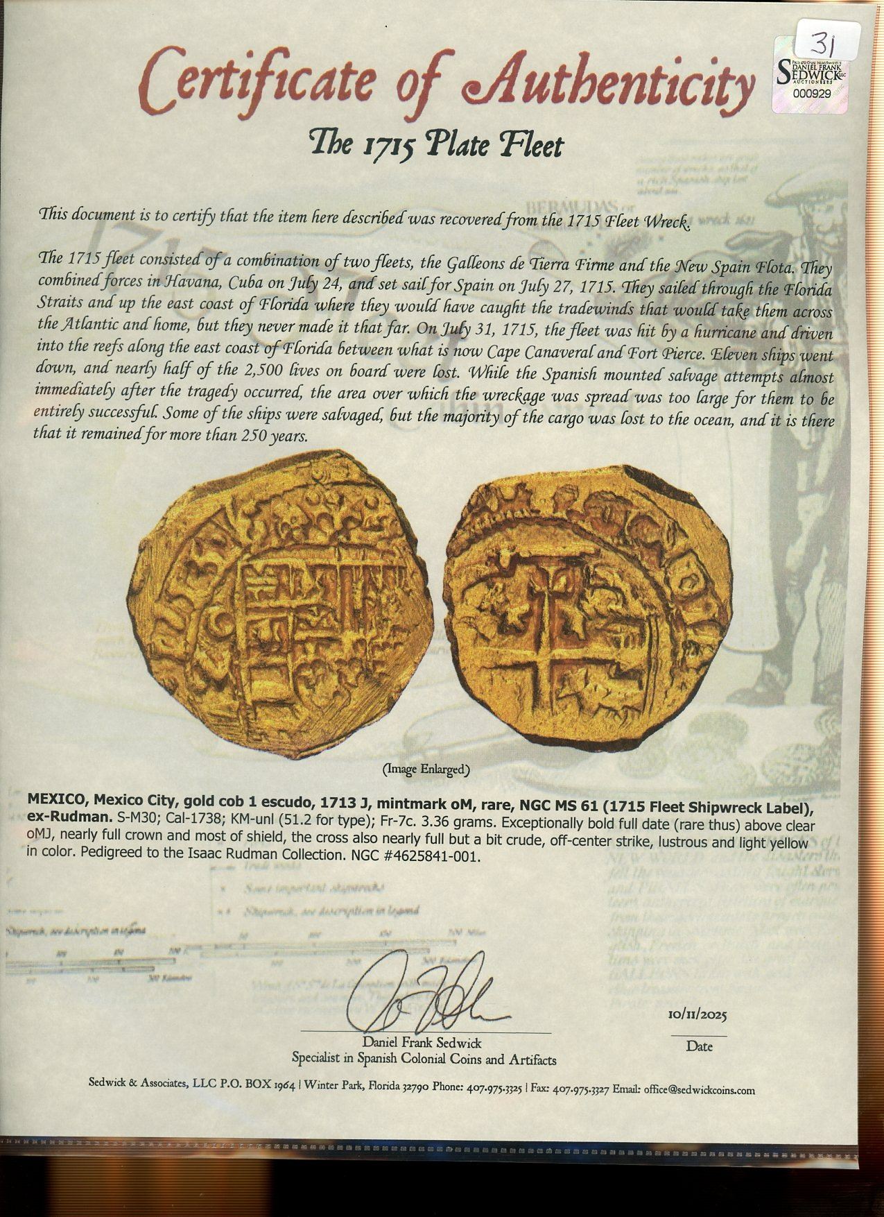 MEXICO, Mexico City, gold cob 1 escudo, 1713 J, mintmark oM, rare, NGC MS 61 (1715 Fleet Shipwreck Label), ex-McGregor, ex-Rudman. S-M30; Cal-1738; KM-unl (51.2 for type); Fr-7c. 3.36 grams. Exceptionally bold full date (rare thus) above clear oMJ, nearly full crown and most of shield, the cross also nearly full but a bit crude, off-center strike, lustrous and light yellow in color. From the 1715 Fleet, with Sedwick photo-certificate, pedigreed to the McGregor Collection (stated on label), and to the Isaac Rudman Collection (Heritage auction of April 2018, lot 31322).