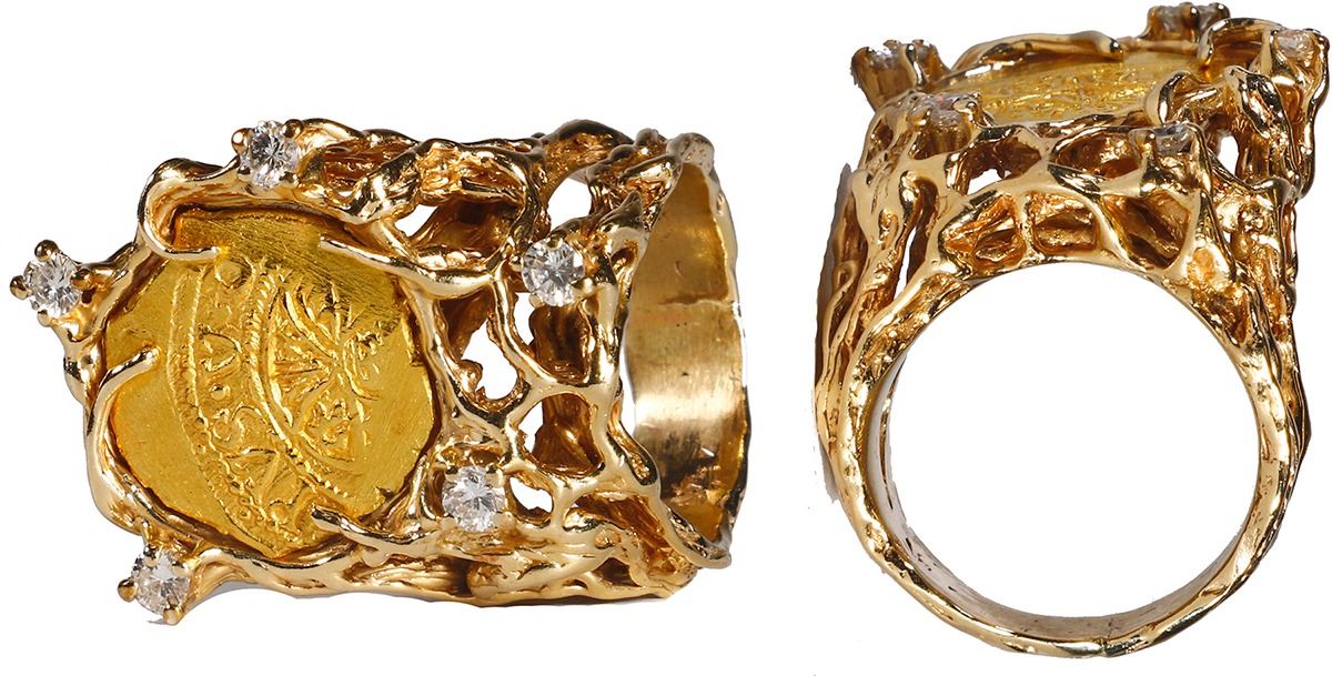 MEXICO, Mexico City, gold cob 1 escudo, Philip V, assayer not visible, style of 1702-10, ex-1715 Fleet, mounted shield-side out in unique 14K gold ring (size 7) with diamonds. 19.35 grams. Unique and beautiful custom-made piece with a gold-and-diamond coral design reaching out to surround the offset coin, which itself is quite nice and lustrous, its off-center obverse on top showing bold king's ordinal V and partial king's name, the cross side on bottom visible enough through the "coral" to note that it is the "box-end" type that lasted through 1710 only. From the 1715 Fleet.