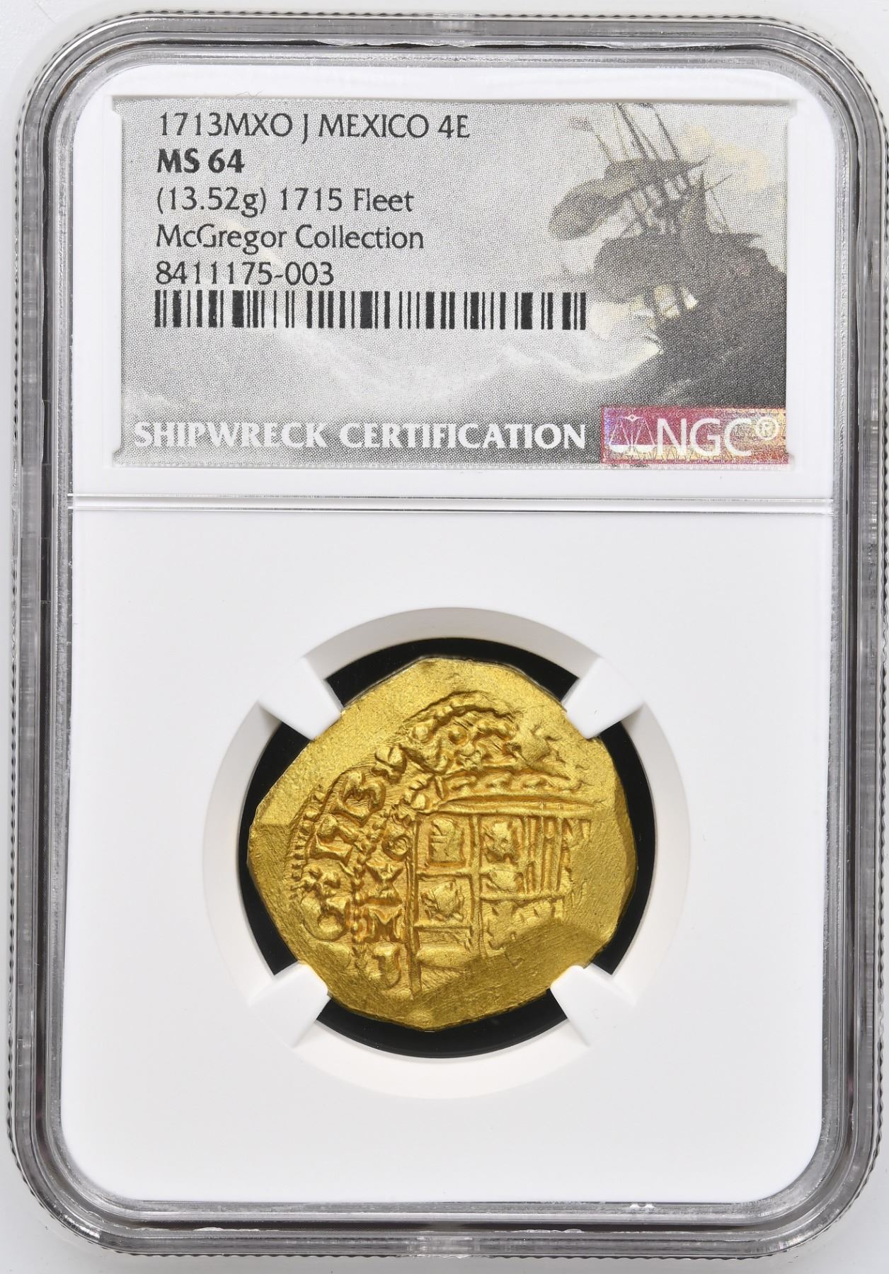 MEXICO, Mexico City, gold cob 4 escudos, 1713 J, NGC MS 64 (1715 Fleet Shipwreck Label), ex-McGregor. S-M30; Cal-2028; KM-55.1; Fr-7a. 13.52 grams. Spectacularly deep strike with what Flemming describes as "unimprovable luster and color," very choice and 100% full date and oXMJ to left of off-center shield with equally bold and nearly full crown above, the cross also bold but off-center, no doubt one of the best examples known for this date. From the 1715 Fleet, with Philip Flemming photo-certificate from 2016, pedigreed to the McGregor Collection (stated on label).