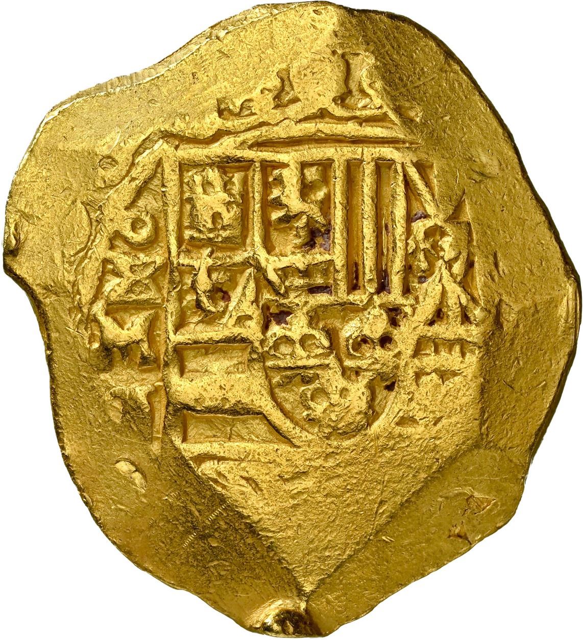 MEXICO, Mexico City, gold cob 8 escudos, 1708 J, very rare, NGC AU details / removed from jewelry (1715 Fleet Shipwreck Label). S-M30; Cal-2204; KM-57.1; Fr-6. 26.89 grams. Clear bottom of 08 of date (one of only three examples we can confirm) outside of bold full oXMJ to left of nearly full shield, most of cross ("box-end" style), typically beveled peripheries with blunted edge-points (as made) that we suspect NGC mistook for mounting damage, light yellow color, some stray marks. From the 1715 Fleet.