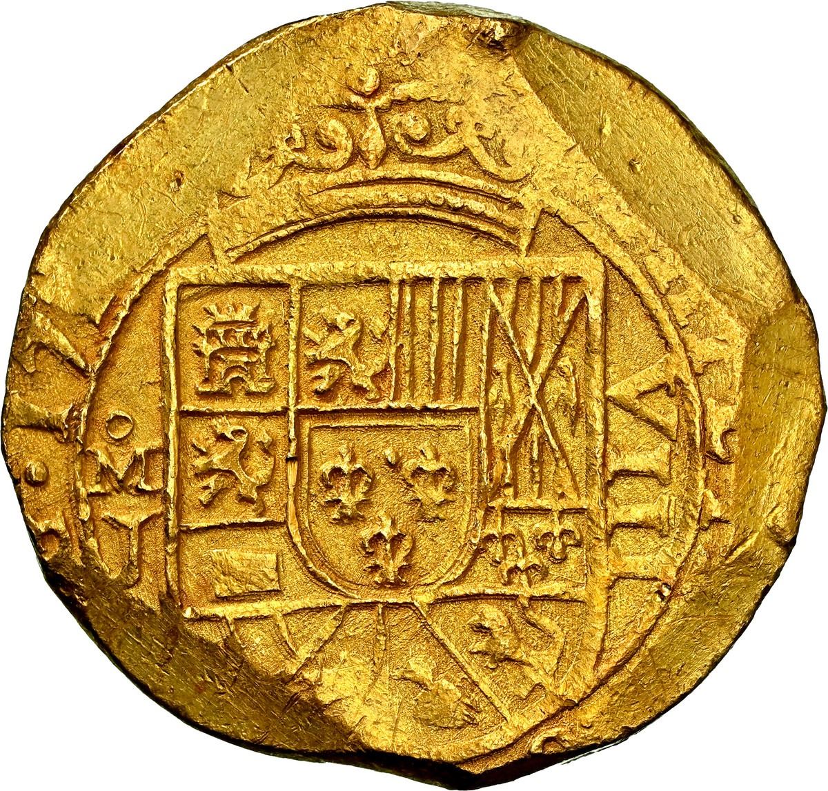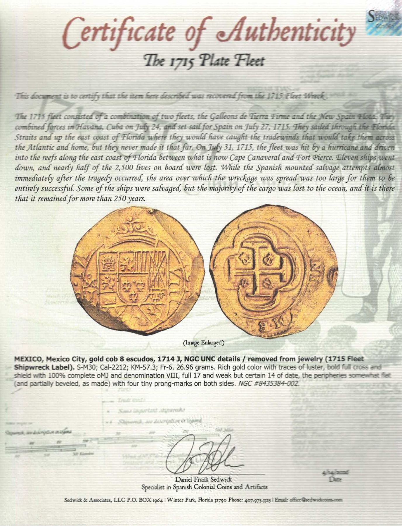 MEXICO, Mexico City, gold cob 8 escudos, 1714 J, NGC UNC details / removed from jewelry (1715 Fleet Shipwreck Label). S-M30; Cal-2212; KM-57.3; Fr-6. 26.96 grams. Rich gold color with traces of luster, bold full cross and shield with 100% complete oMJ and denomination VIII, full 17 and weak but certain 14 of date, the peripheries somewhat flat (and partially beveled, as made) with four tiny prong-marks on both sides. From the 1715 Fleet, with photo-certificate.