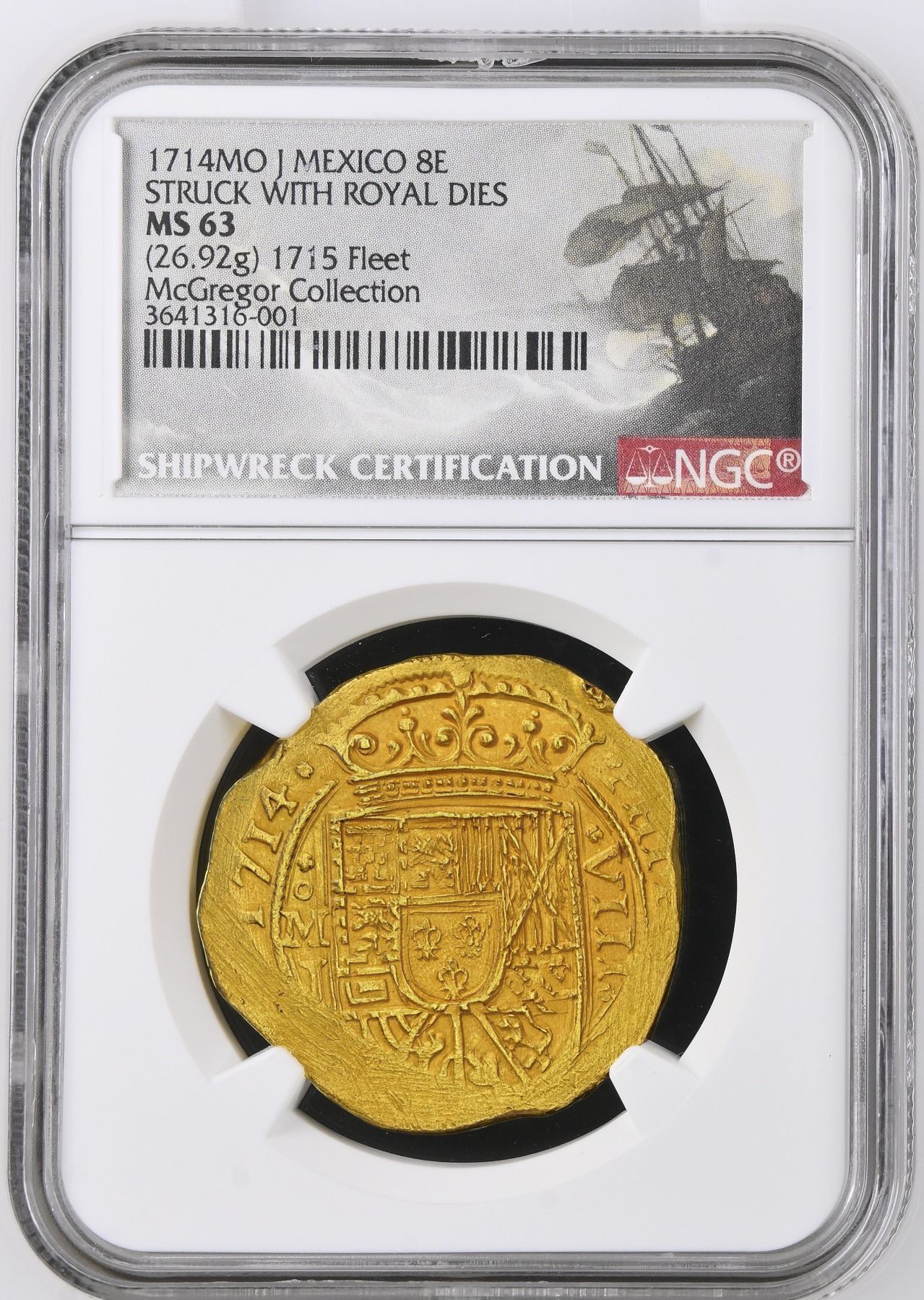 MEXICO, Mexico City, gold cob 8 escudos, 1714 J, struck with Royal dies (both sides), very rare, NGC MS 63 (1715 Fleet Shipwreck Label), finest and only example in NGC census, ex-McGregor, Flemming Plate. S-M30; Cal-unl; KM-57.2; Fr-6. 26.92 grams. Rich gold color with muted luster, very choice full cross-and-tressure, the shield also full but very slightly doubled at top left below a choice full crown, bold date in legend and clear oMJ and VIII, the peripheries partially flat and/or beveled as usual but the details clearly sharper than normal and with special elements (like "daggers" in the tressure-dimples) indicative of Royal dies, which Flemming catalogs as Variety 5 and describes as evidence of a stopgap measure after the regular-production dies had failed, now clearly desirable beyond the level of a "normal" 1714, one of only three known by our records. From the 1715 Fleet, with Philip Flemming photo-certificate from 2014 and plated on page 11 of his article "Varieties of the 1714 Mexico City 8 Escudos" in the June 2014 issue of the journal of the U.S. Mexican Numismatic Association (offprint copy included), pedigreed to the McGregor Collection (stated on label).