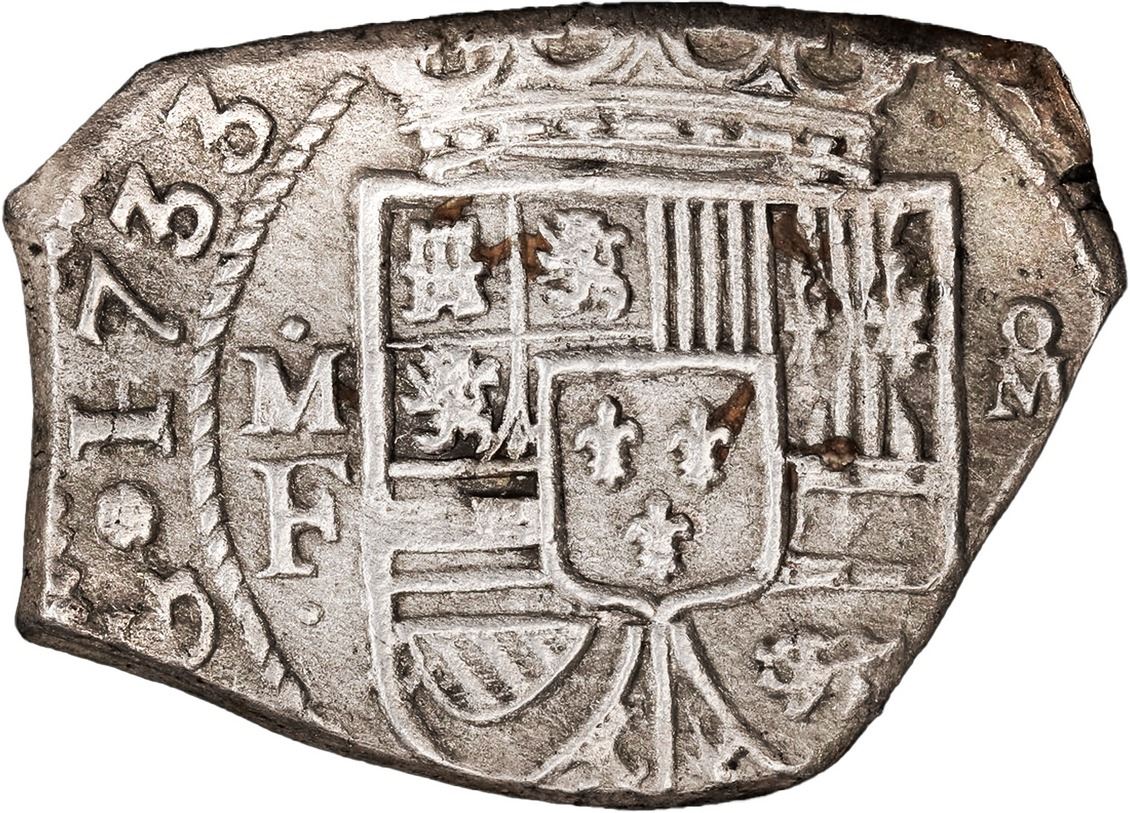 MEXICO, Mexico City, klippe 4 reales, 1733 MF, PCGS AU details / saltwater damage (Rooswijk). S-M28; KM-41; Cal-1100. 12.48 grams. Smallish oblong flan oriented perfectly to accommodate a full and bold date and assayer, also with very sharp full shield and cross, oM mintmark to right, lightly toned and practically corrosion-free (fully UNC in our opinion), far scarcer than the 8 reales, especially this nice. With original certificate from salvors. Recovered from: Rooswijk, sunk in 1739 southeast of England