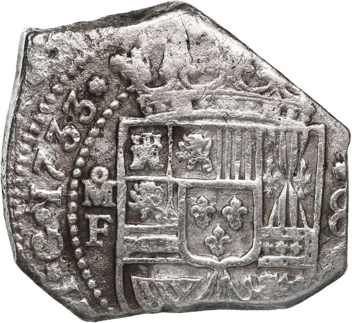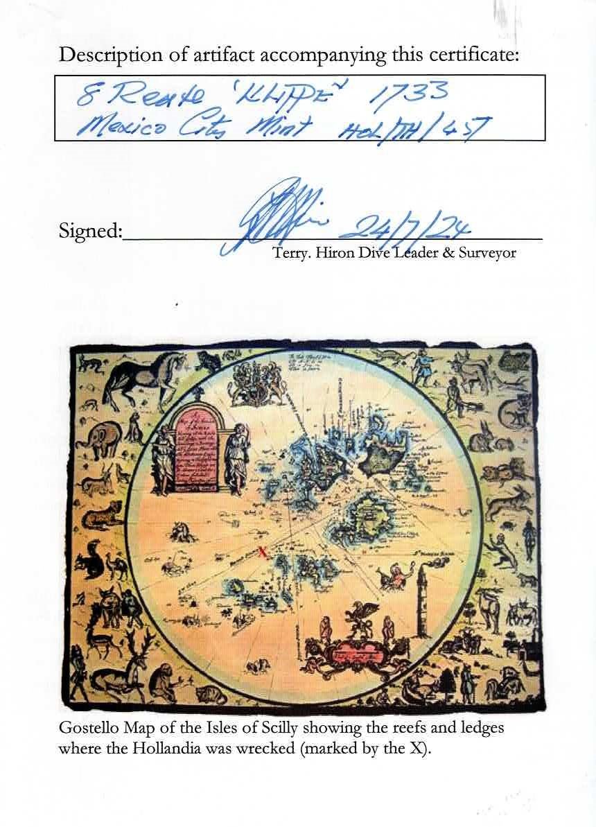 MEXICO, Mexico City, klippe 8 reales, 1733 F. S-M27; KM-48; Cal-1430. 26.00 grams. Somewhat compact flan ("cob" style), all slightly off-center but with best parts visible including bold full date and oMF to left of well-detailed and nearly full shield, part of denomination 8 to right, good full cross, minimal surface corrosion, very lightly toned on fields. With photo-certificate HOL/TH/651 from the salvor. Recovered from: Hollandia, sunk in 1743 off the Isles of Scilly, southwest of England